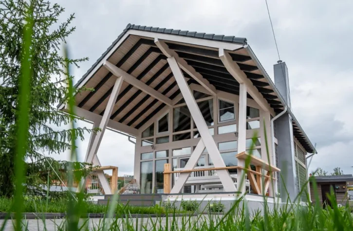 В технологиях фахверка стекло становится не просто заполнением проемов, а важной частью образа дома. Деревянный каркас формирует ритм фасада, а большие стеклянные поверхности создают ощущение прозрачности и связи с окружающим ландшафтом.