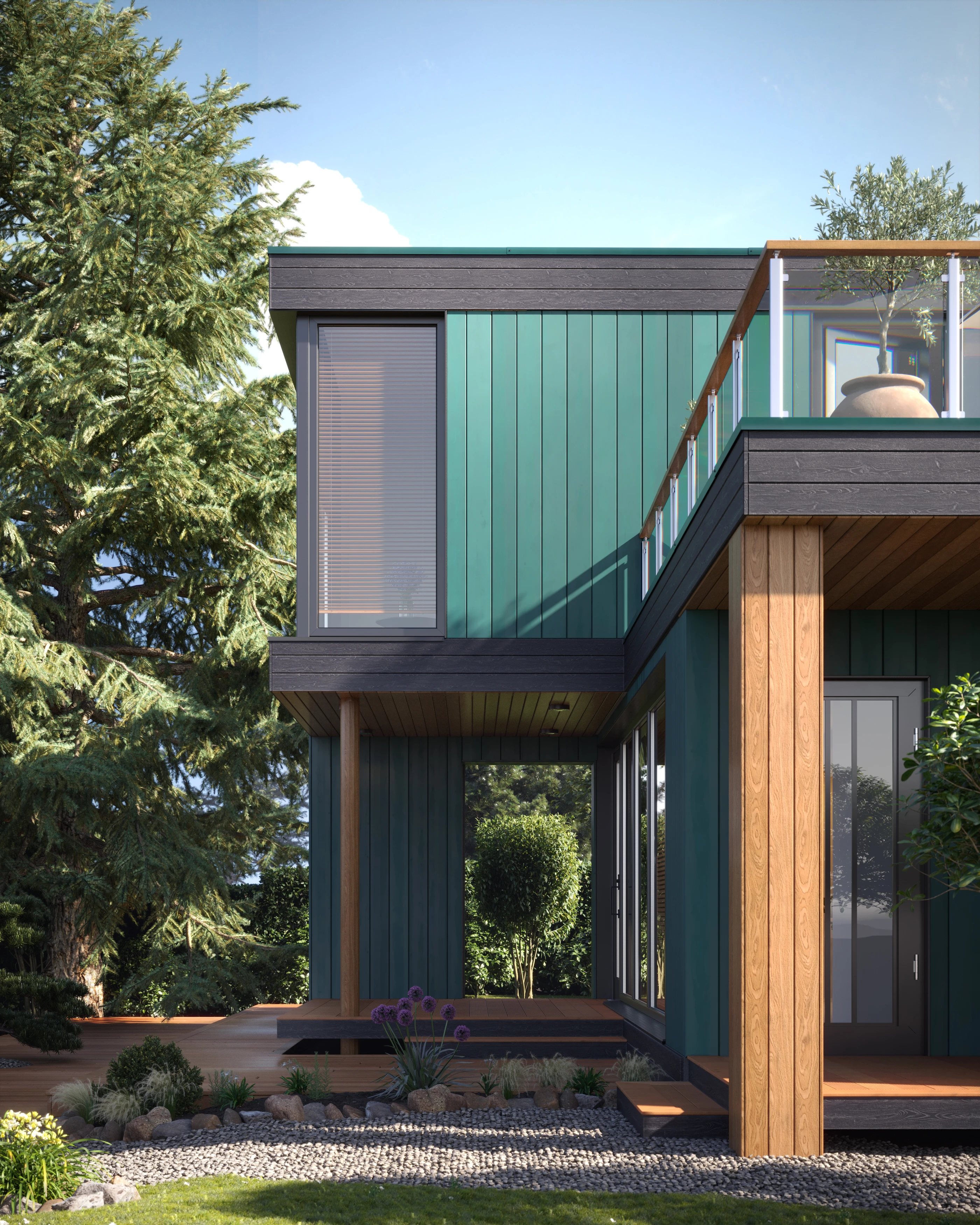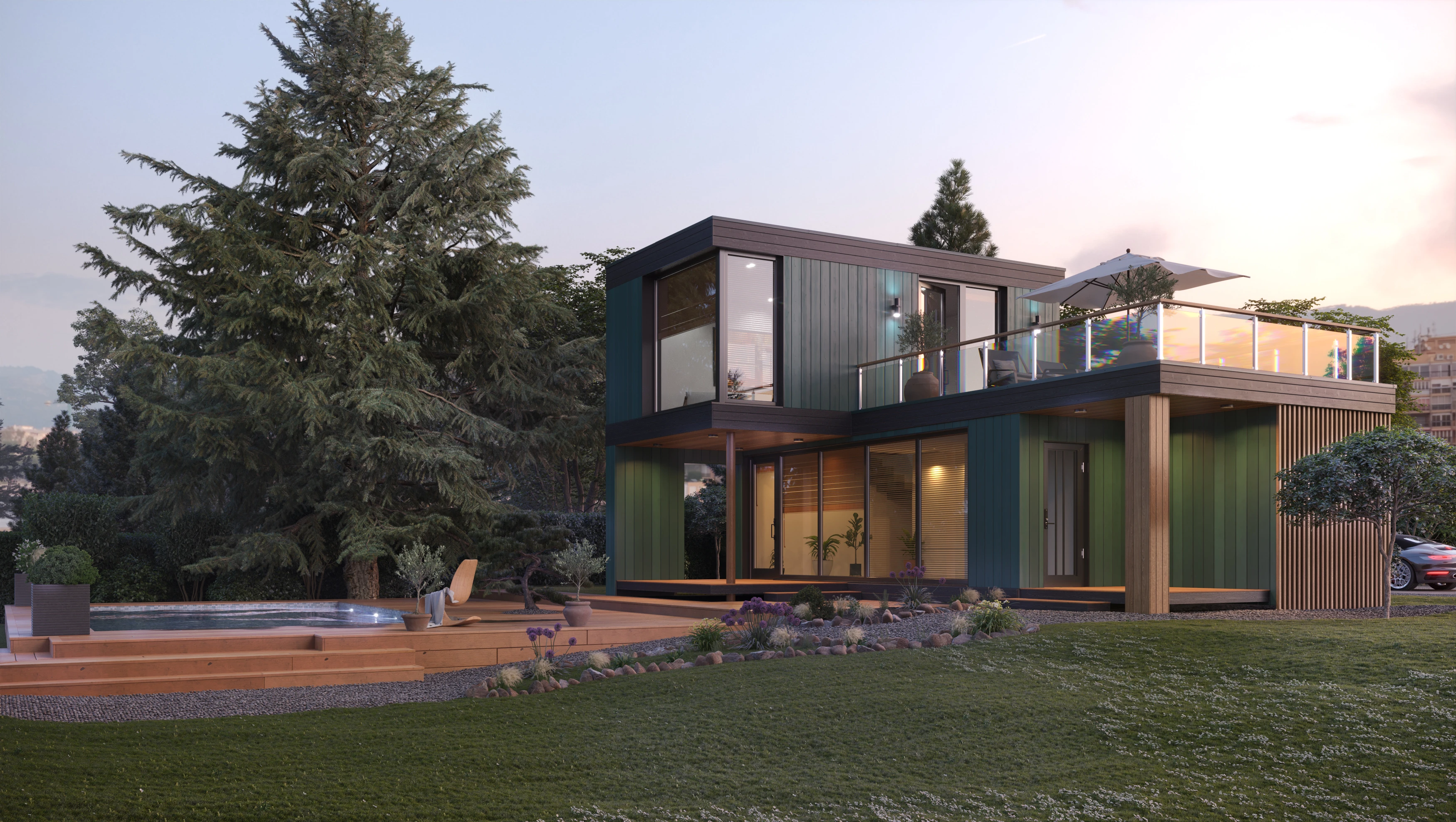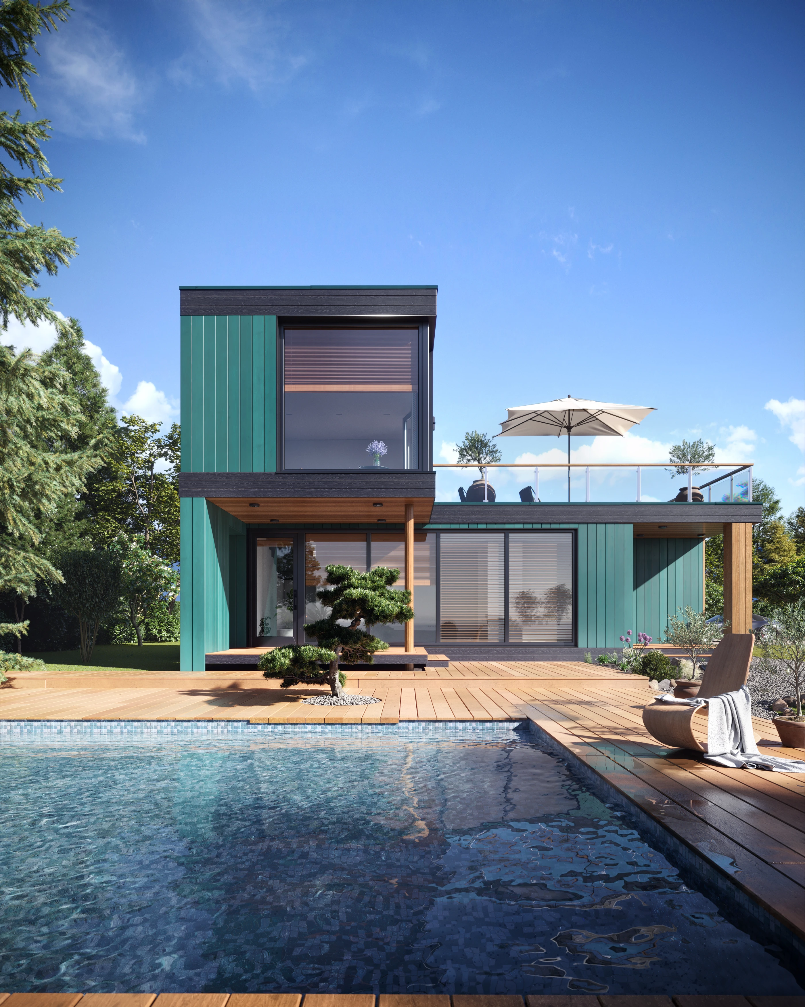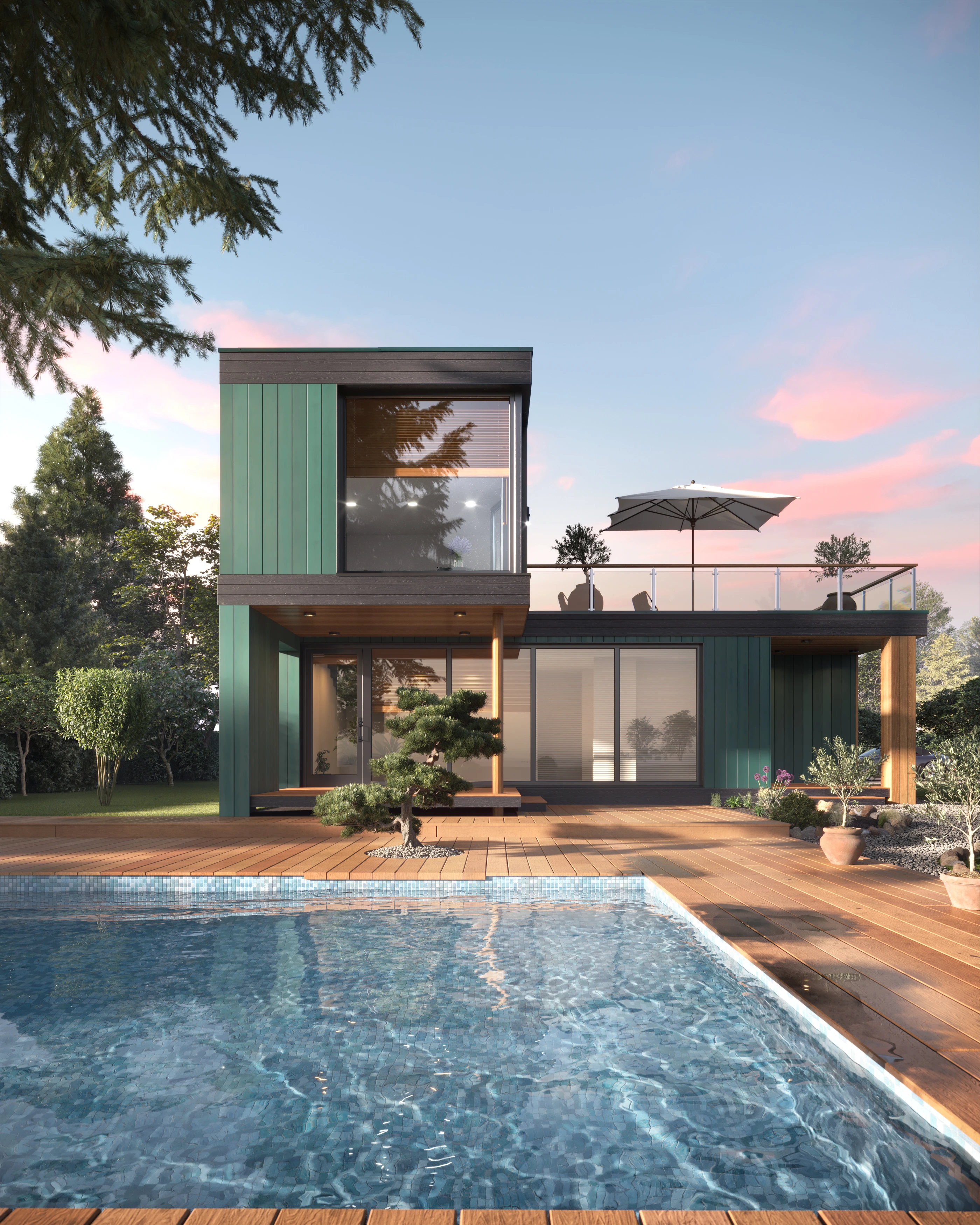 Двухуровневый глэмп с приватной террасой — это компактный дом для отдыха, сочетающий выразительную архитектуру и комфорт проживания в природной среде. Объем решен в виде двух смещенных уровней, формирующих защищенное пространство первого этажа и открытую террасу на втором.
