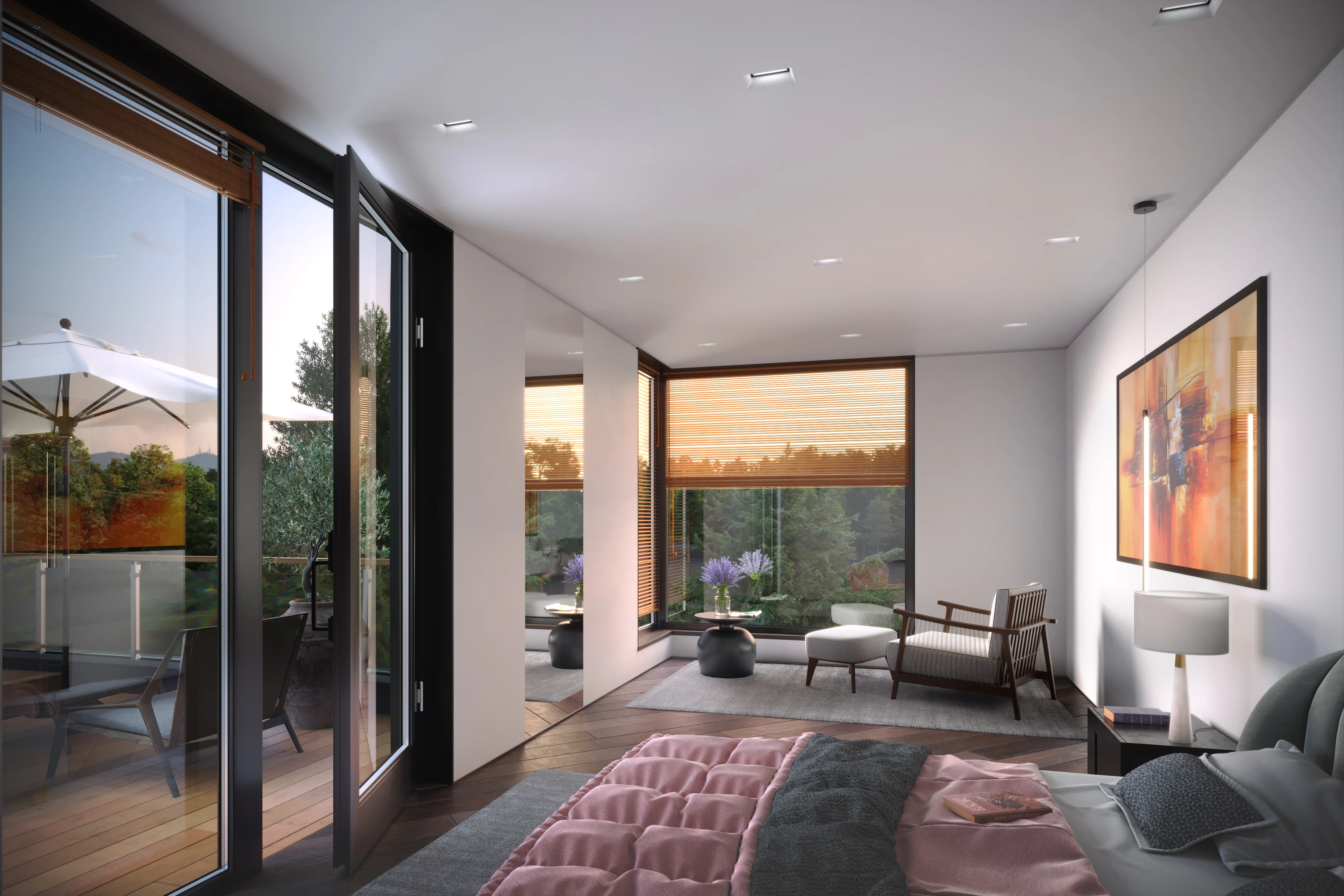Интерьер глэмпа решен в сдержанной современной эстетике с акцентом на комфорт и визуальную связь с природой. Пространство построено вокруг панорамного остекления: угловые окна и выход на террасу обеспечивают максимальное проникновение естественного света и открывают виды на ландшафт. За счет этого интерьер воспринимается продолжением внешней среды, а граница между домом и природой становится минимальной.