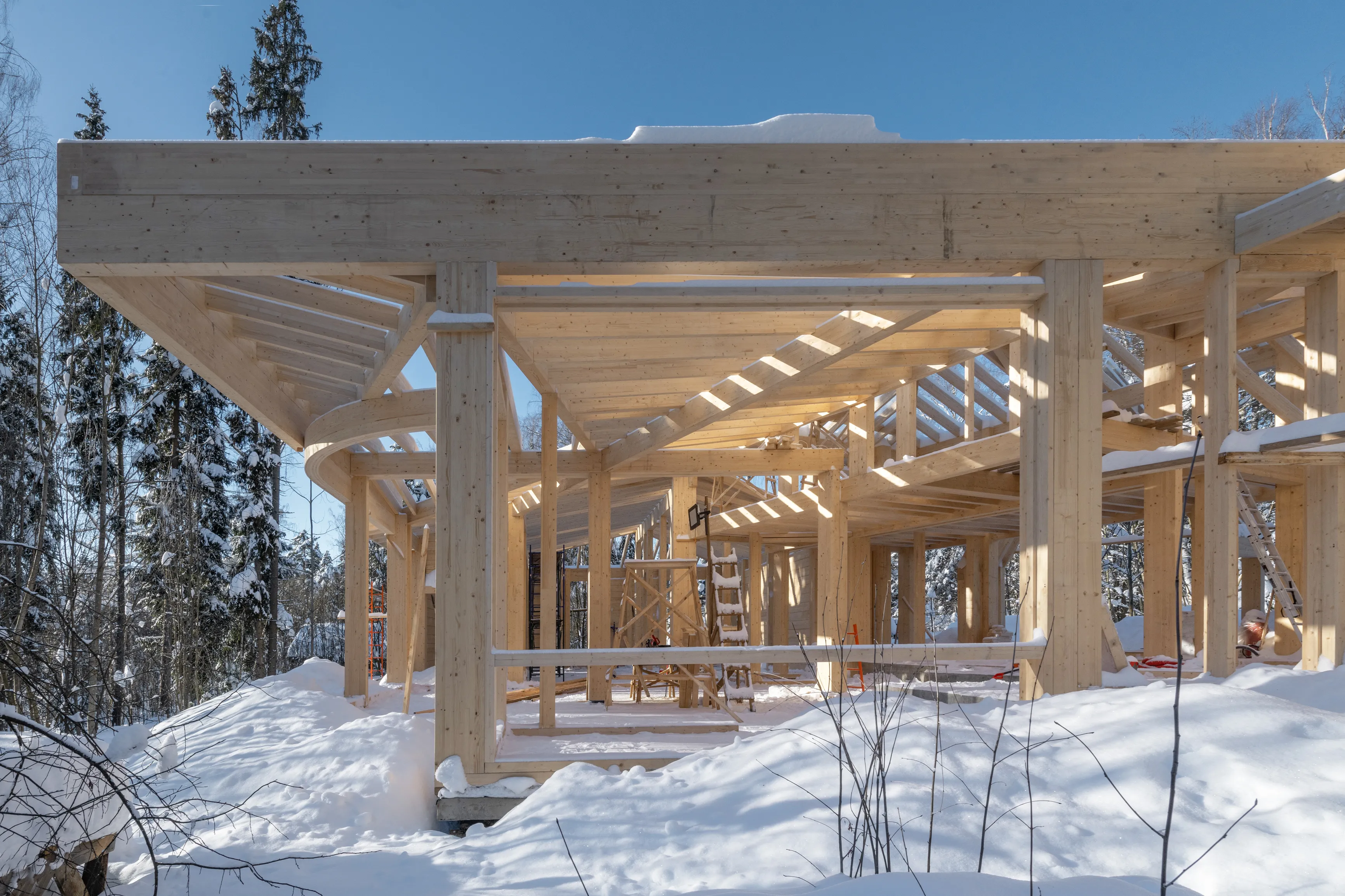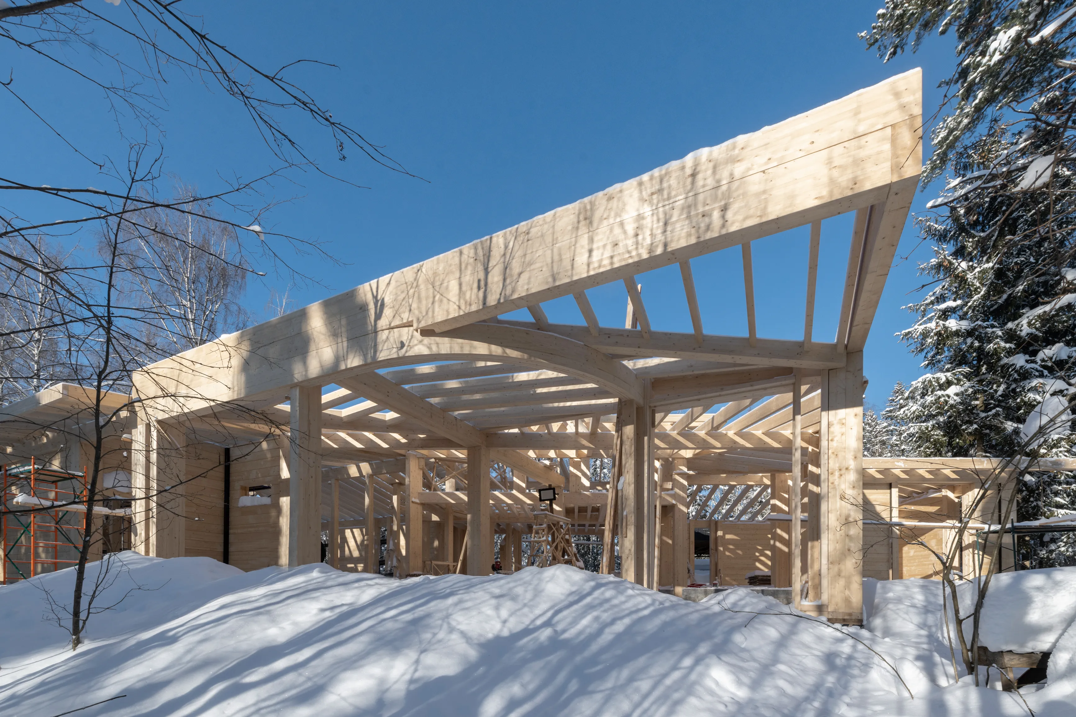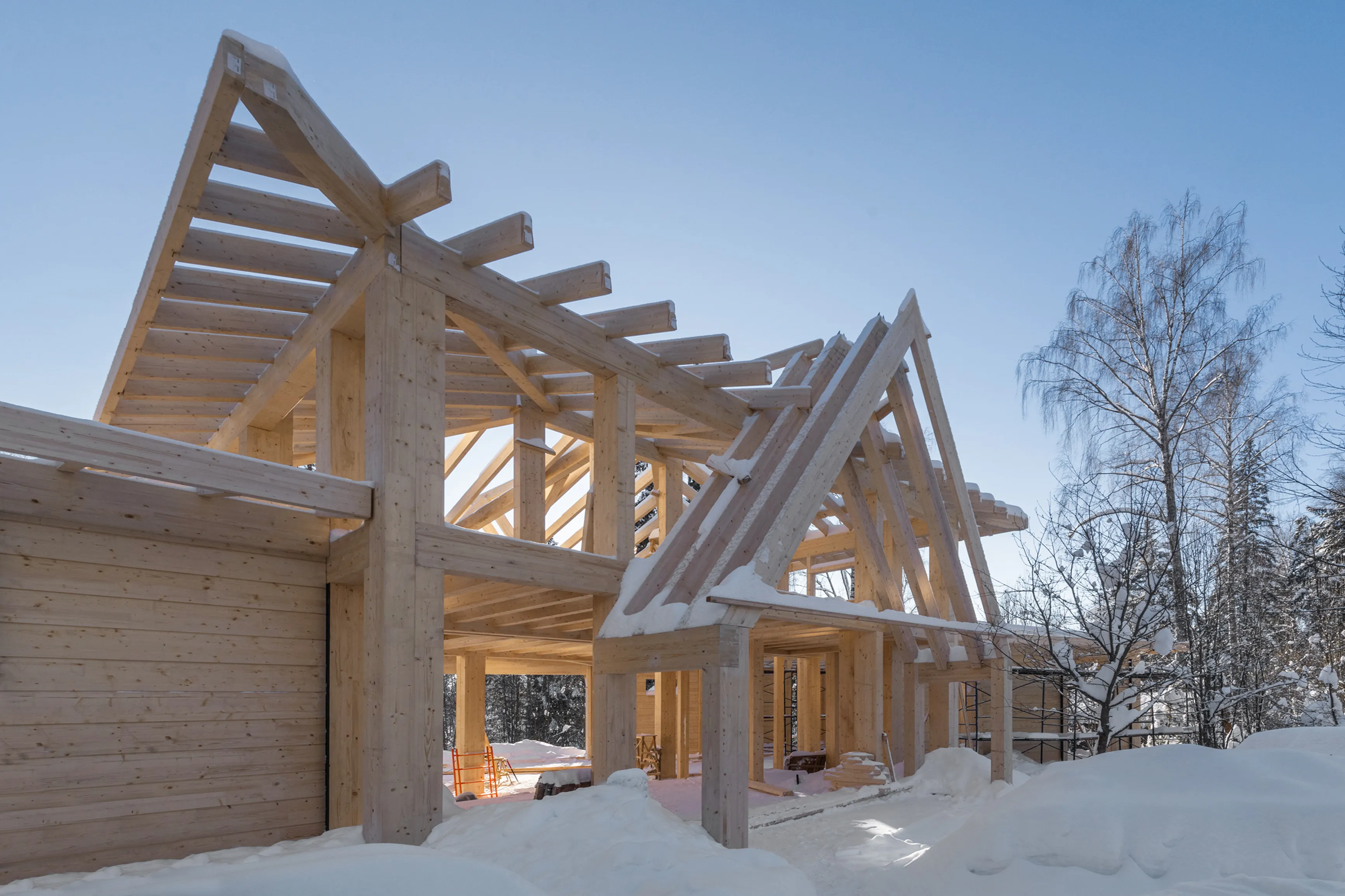 В основе здания — стоечно-балочная конструкция (фахверк) из клееной древесины. Такая система позволяет создавать большие пролеты и формировать открытые пространства интерьера. Основные несущие стойки имеют сечение 80×200 мм. В ключевых узлах применены сдвоенные стойки 200×400 мм. Стропила выполнены из элементов сечением 80×280 мм. Они опираются на прогоны и коньковые балки сечением от 200×400 мм до 200×480 мм. Благодаря этой системе конструкция остается прочной, при этом архитектура сохраняет легкость и прозрачность.