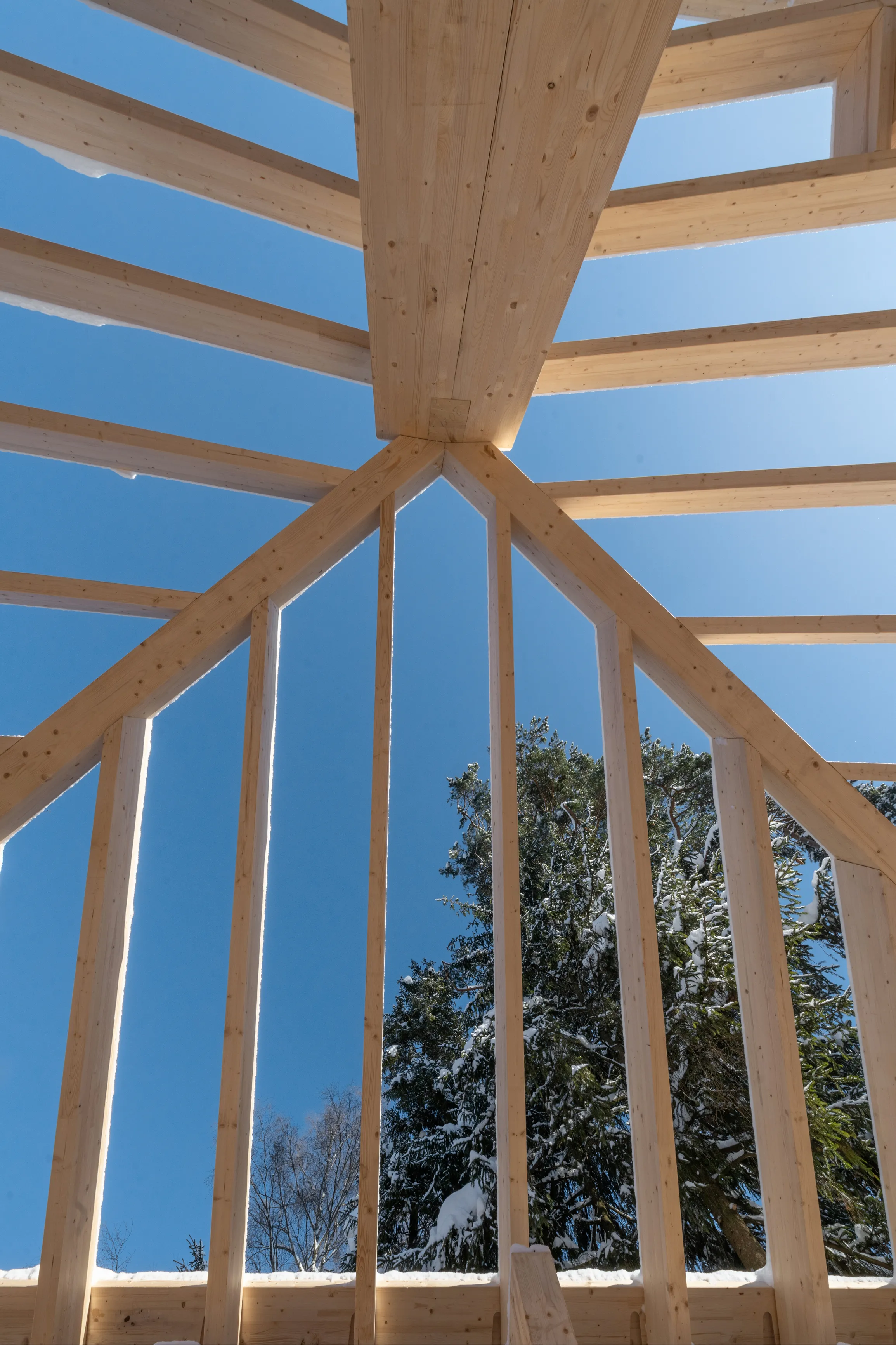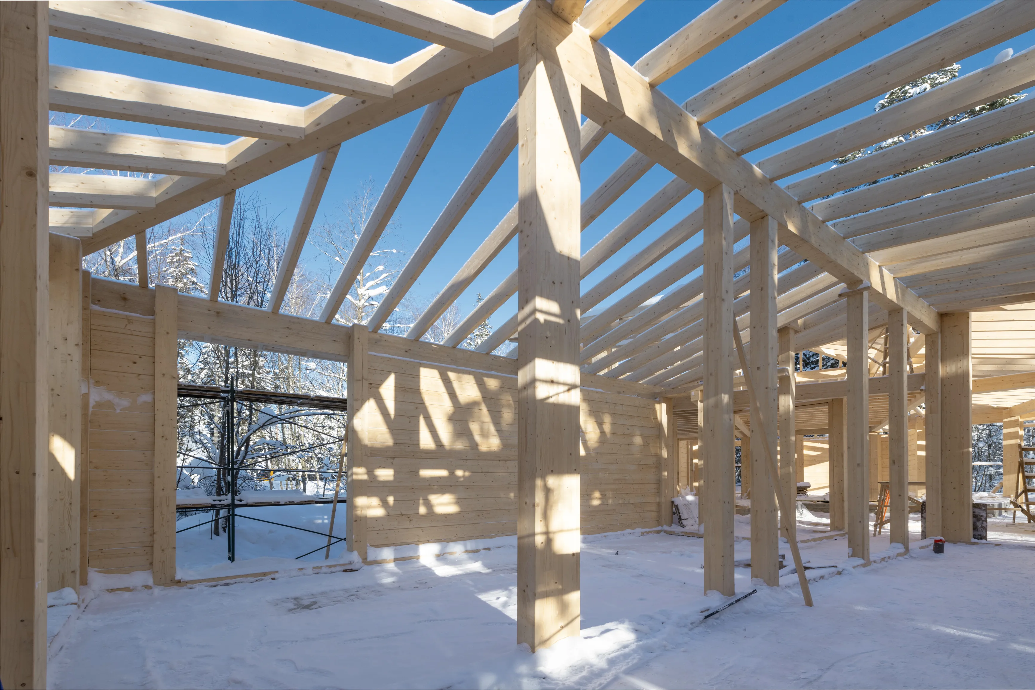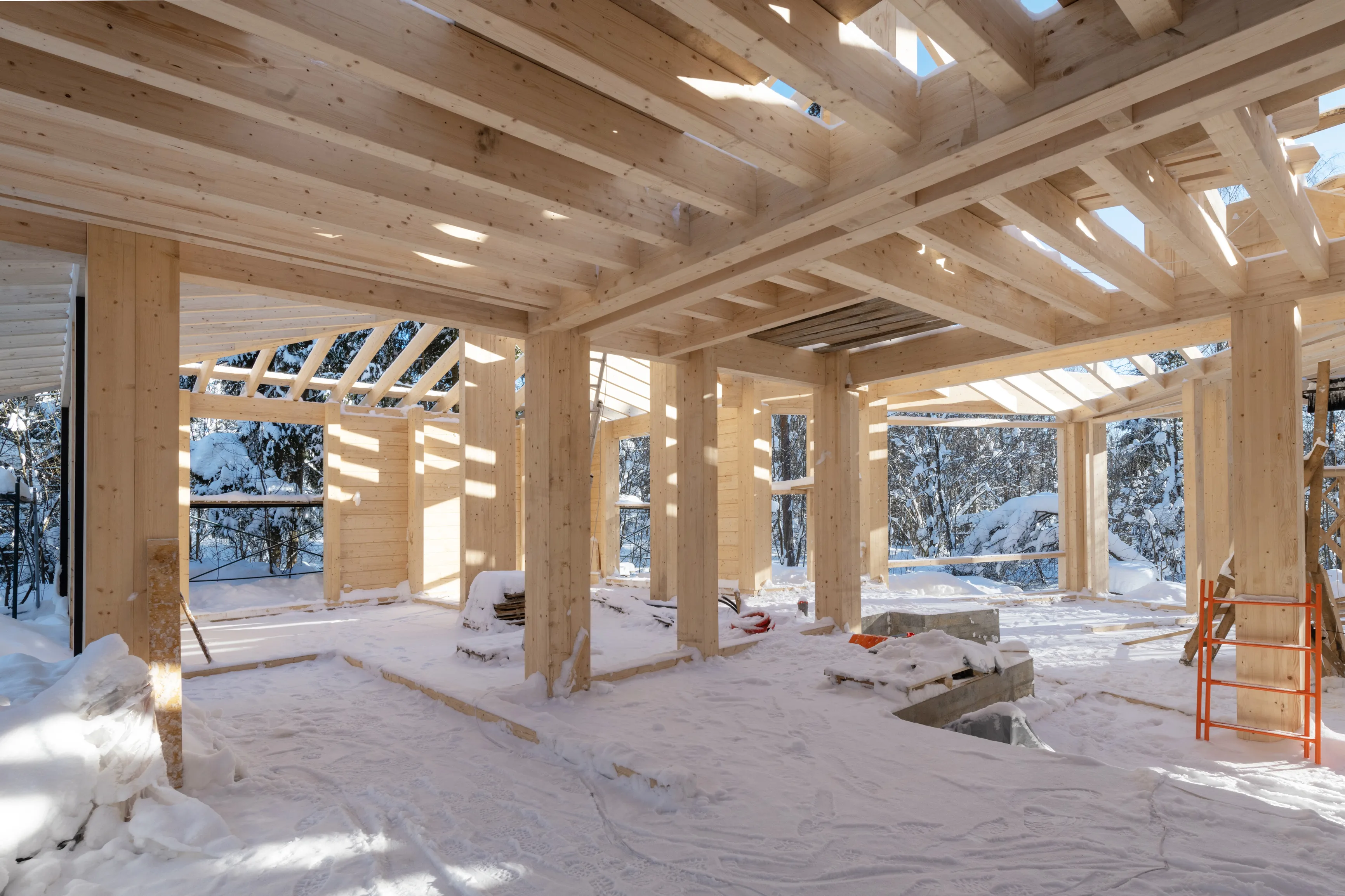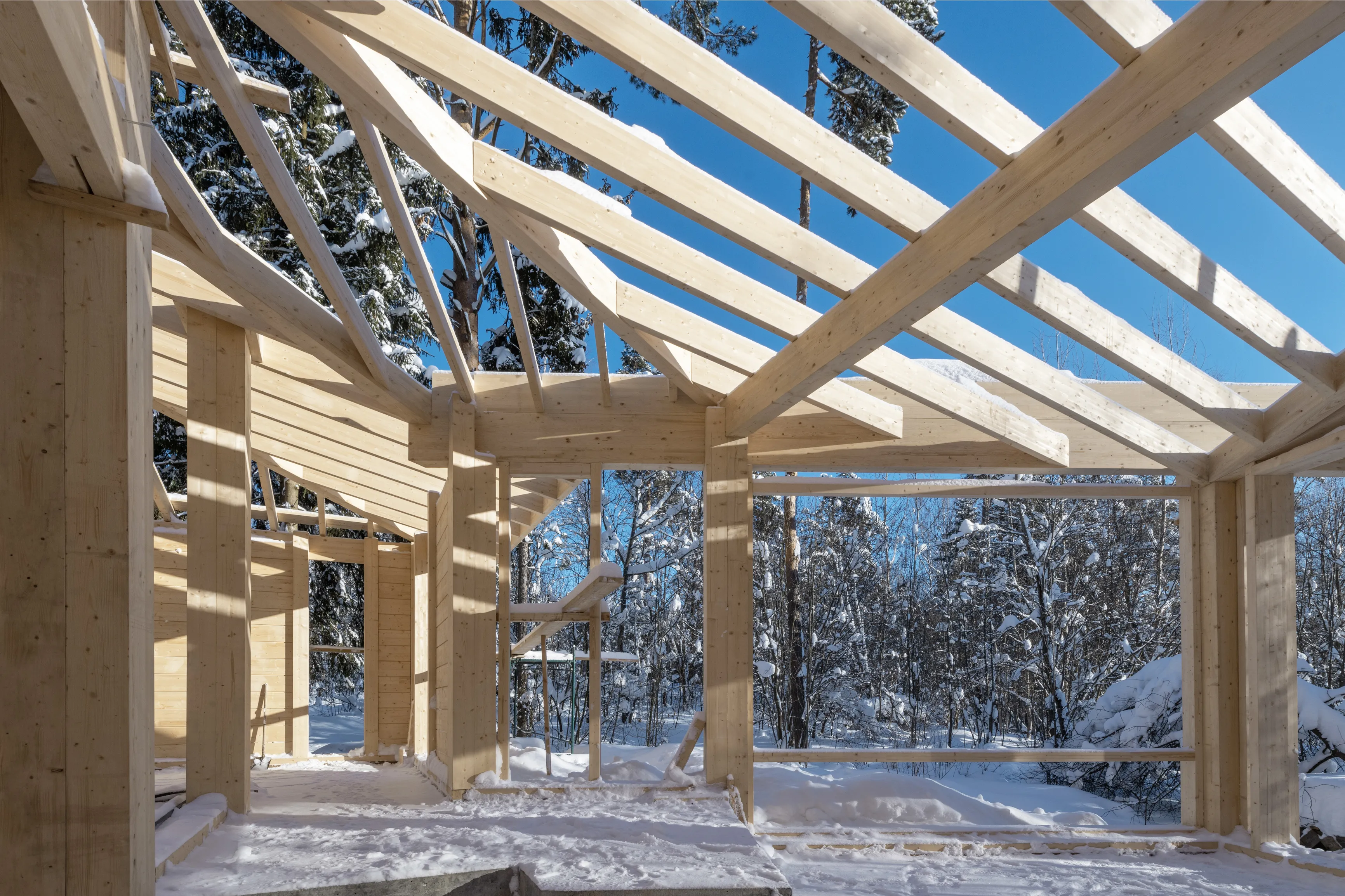 В основе здания — стоечно-балочная конструкция (фахверк) из клееной древесины. Такая система позволяет создавать большие пролеты и формировать открытые пространства интерьера. Основные несущие стойки имеют сечение 80×200 мм. В ключевых узлах применены сдвоенные стойки 200×400 мм. Стропила выполнены из элементов сечением 80×280 мм. Они опираются на прогоны и коньковые балки сечением от 200×400 мм до 200×480 мм. Благодаря этой системе конструкция остается прочной, при этом архитектура сохраняет легкость и прозрачность.