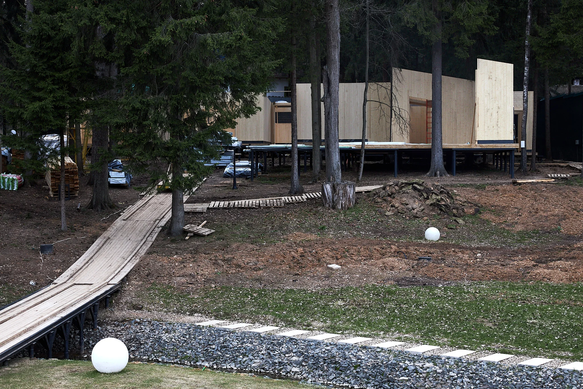 Объект был задуман как исследование возможностей CLT-панелей, только начинавших свой путь на российском рынке. Площадь проектирования 11 га, на которой находятся овраг, река, пруд, 3 родника, реликтовый хвойный лес, перепад рельефа до 7 метров. Территория была тщательно обследована в сотрудничестве со службой охраны леса: больные деревья были удалены, кроны укреплены, а подеревная топосъёмка позволила «вписать» здание в живую ткань леса. При проектировании учитывались даже радиусы шатания деревьев, что придает проекту особую чувствительность к окружающей природе.