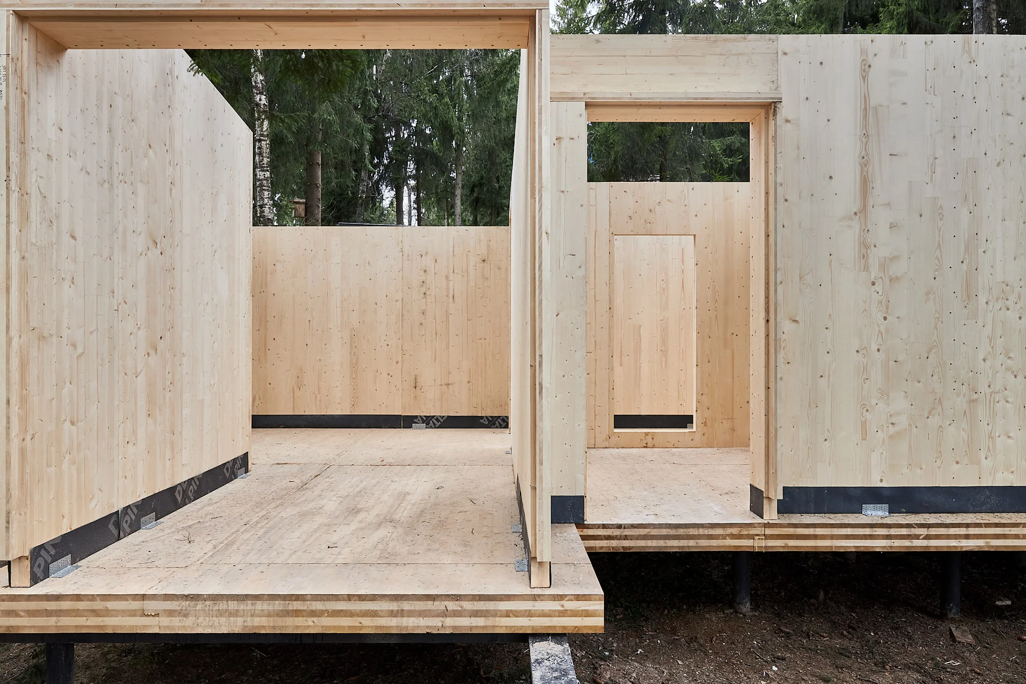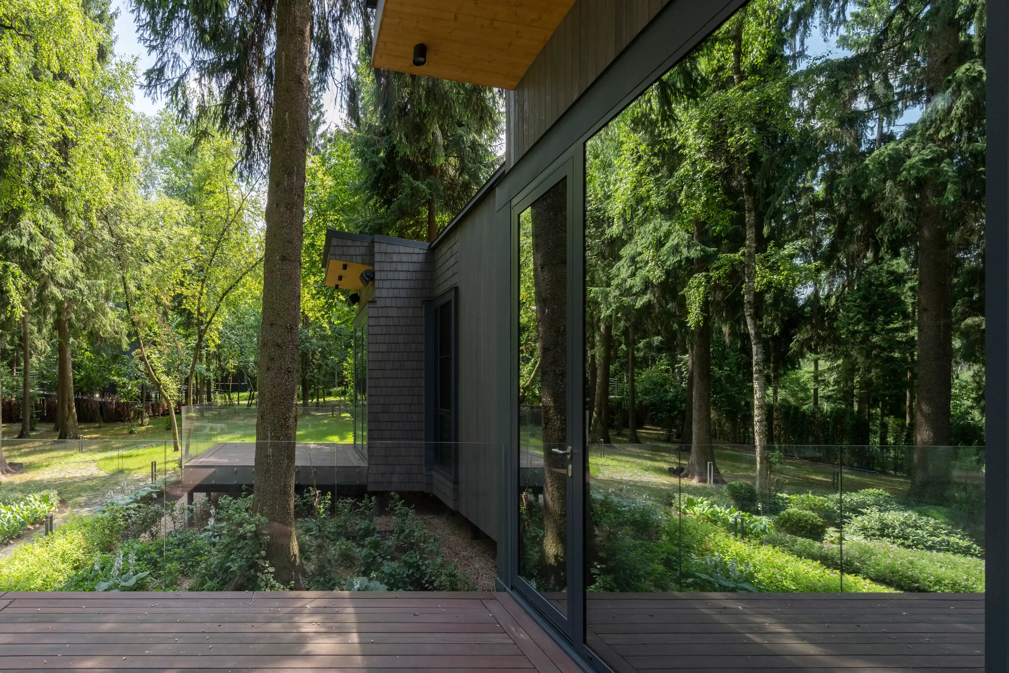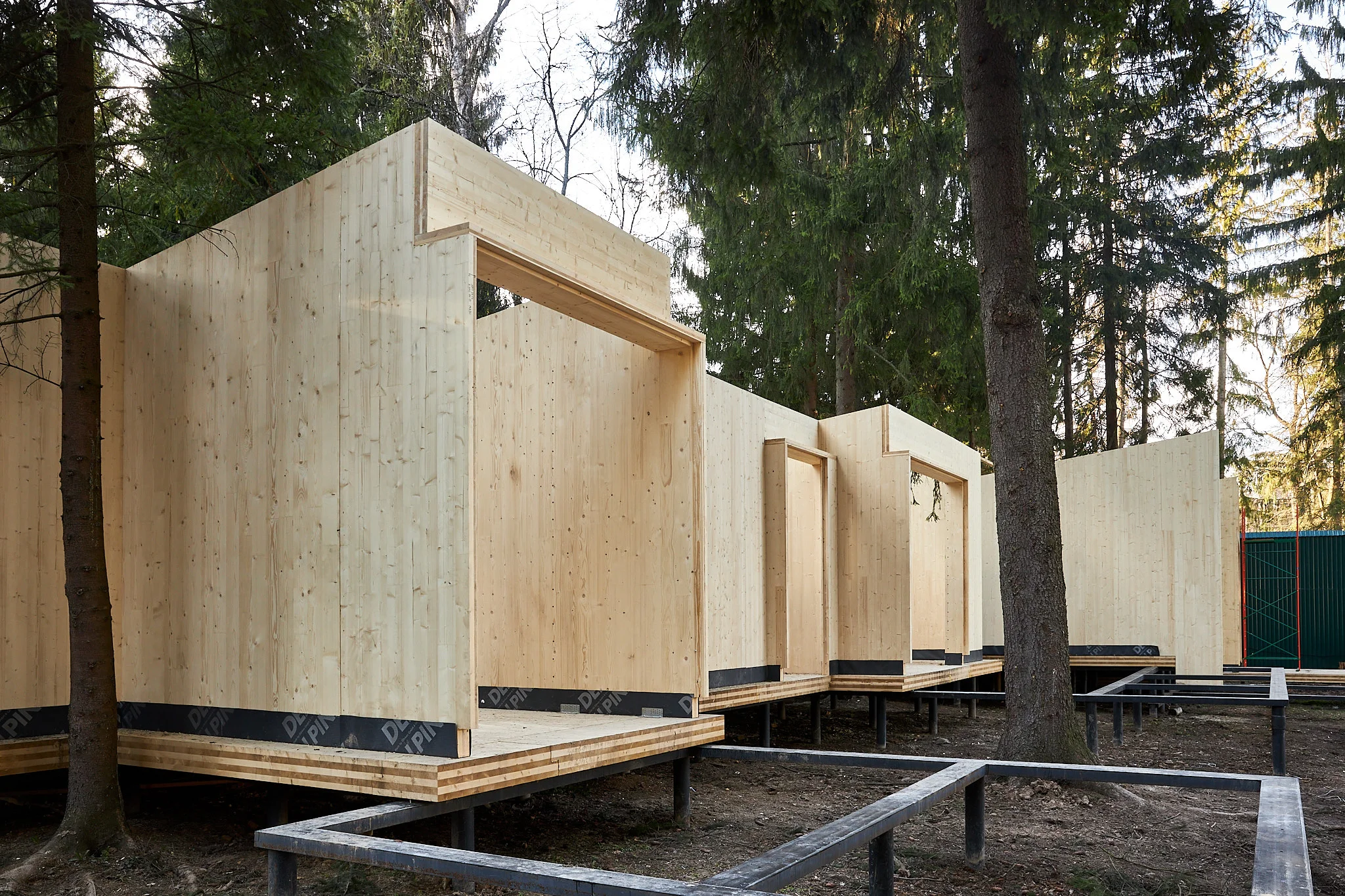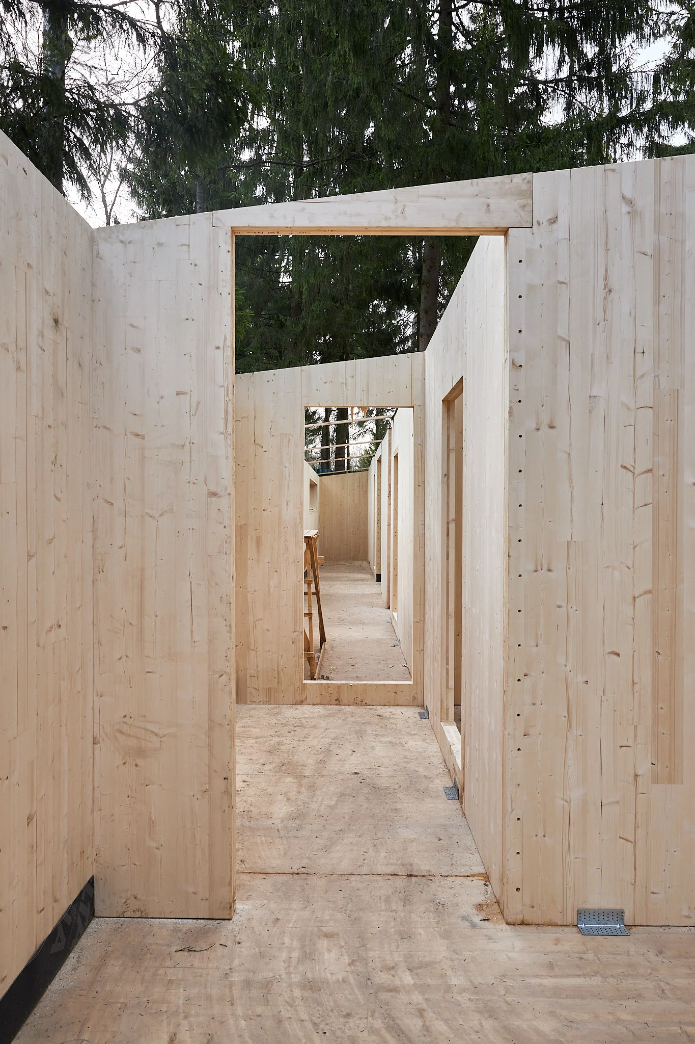 Применение современного и прочного материала CLT позволило выполнить сложное строение, органично вписанное в плотную лесную среду, и сформировать помещения большого объема без дополнительных опор. Так, здание было разделено на два объёма — общественный и жилой, которые соединены стеклянным коридором. Этот переход из структурного остекления, превращает каждый шаг в уникальный опыт: выходя из одной зоны, можно оказаться в еловом лесу, оставаясь при этом в тепле и уюте.
