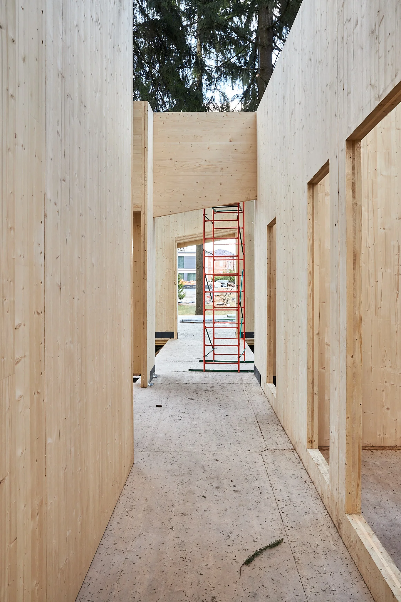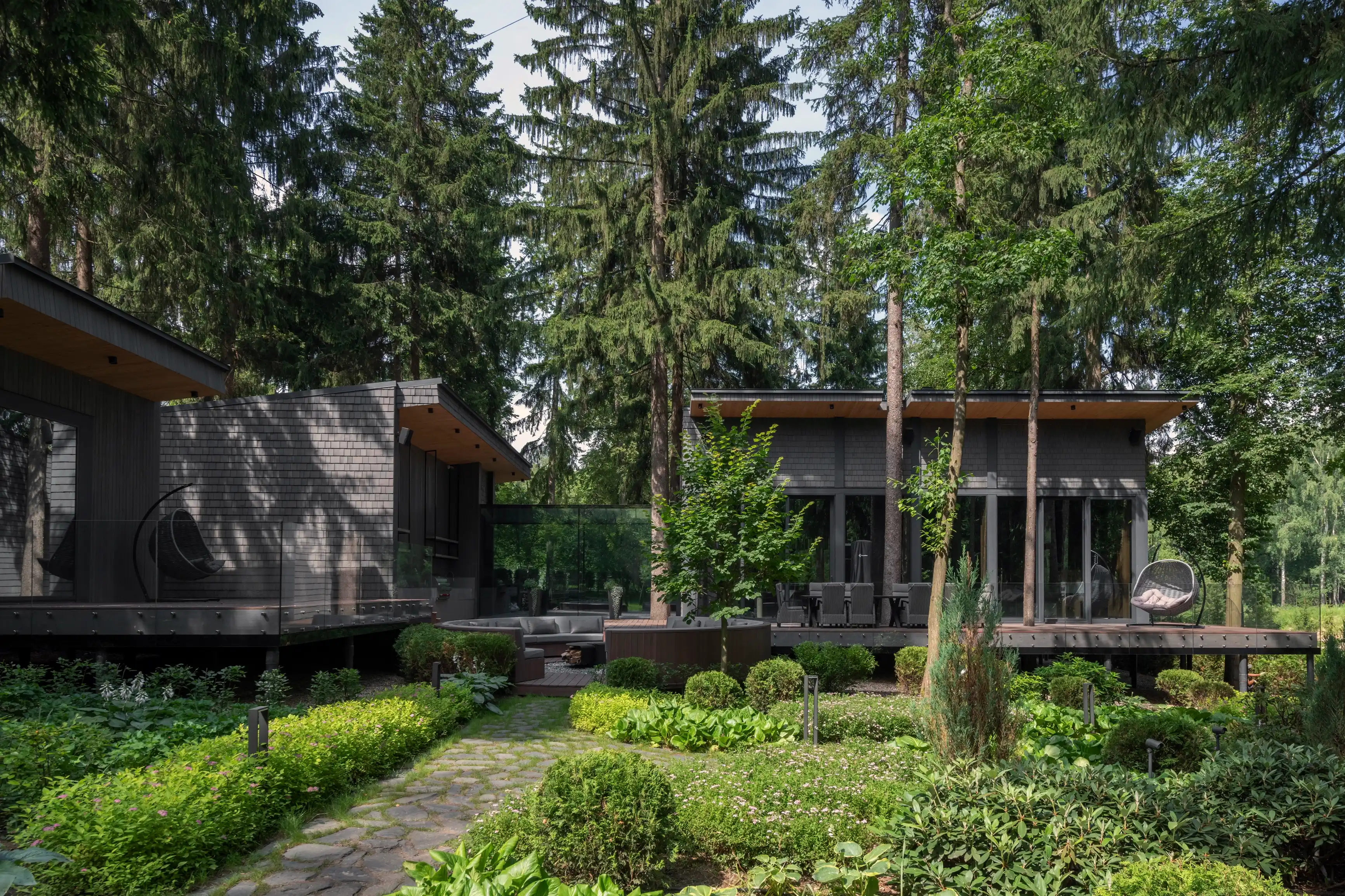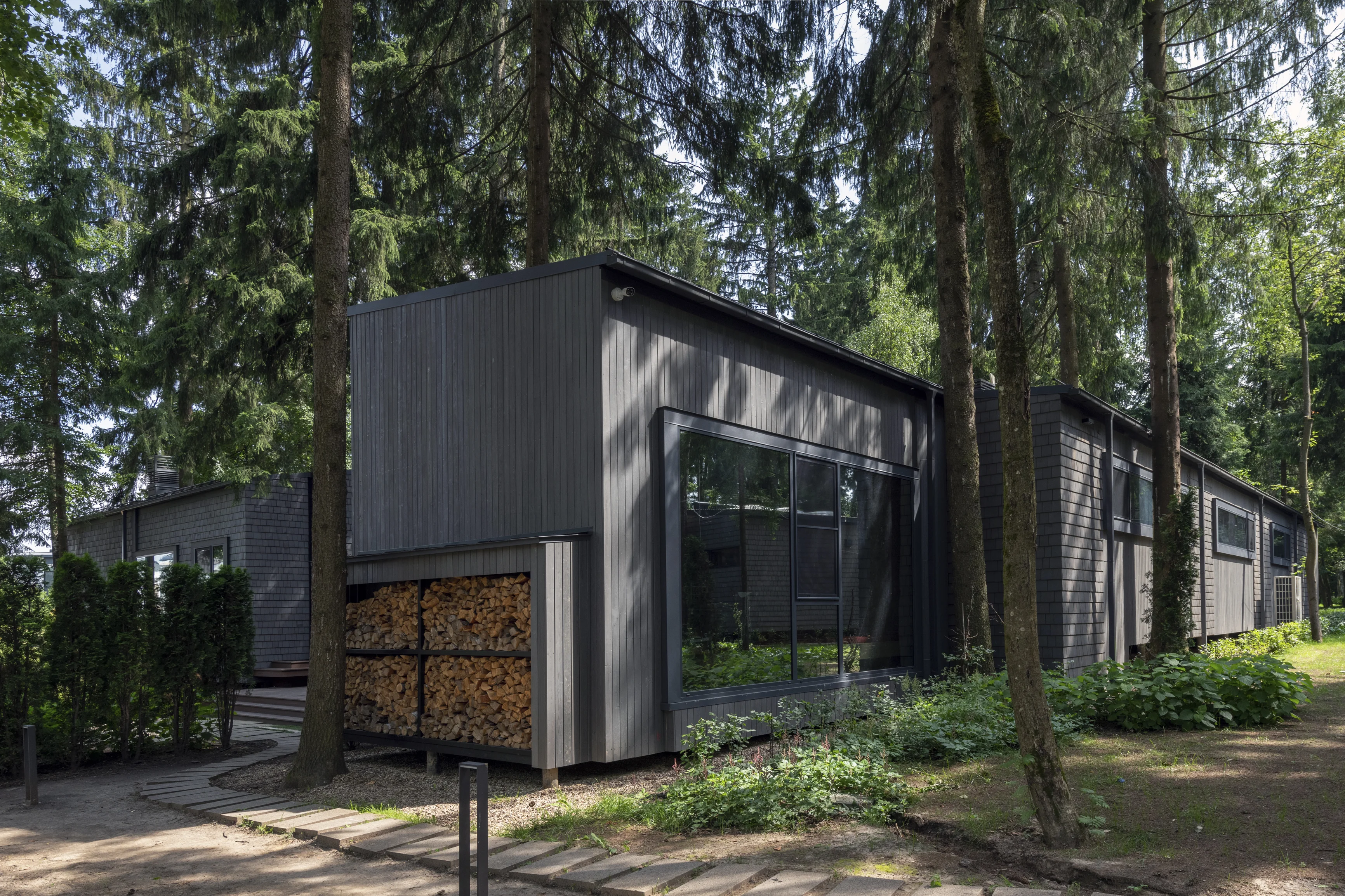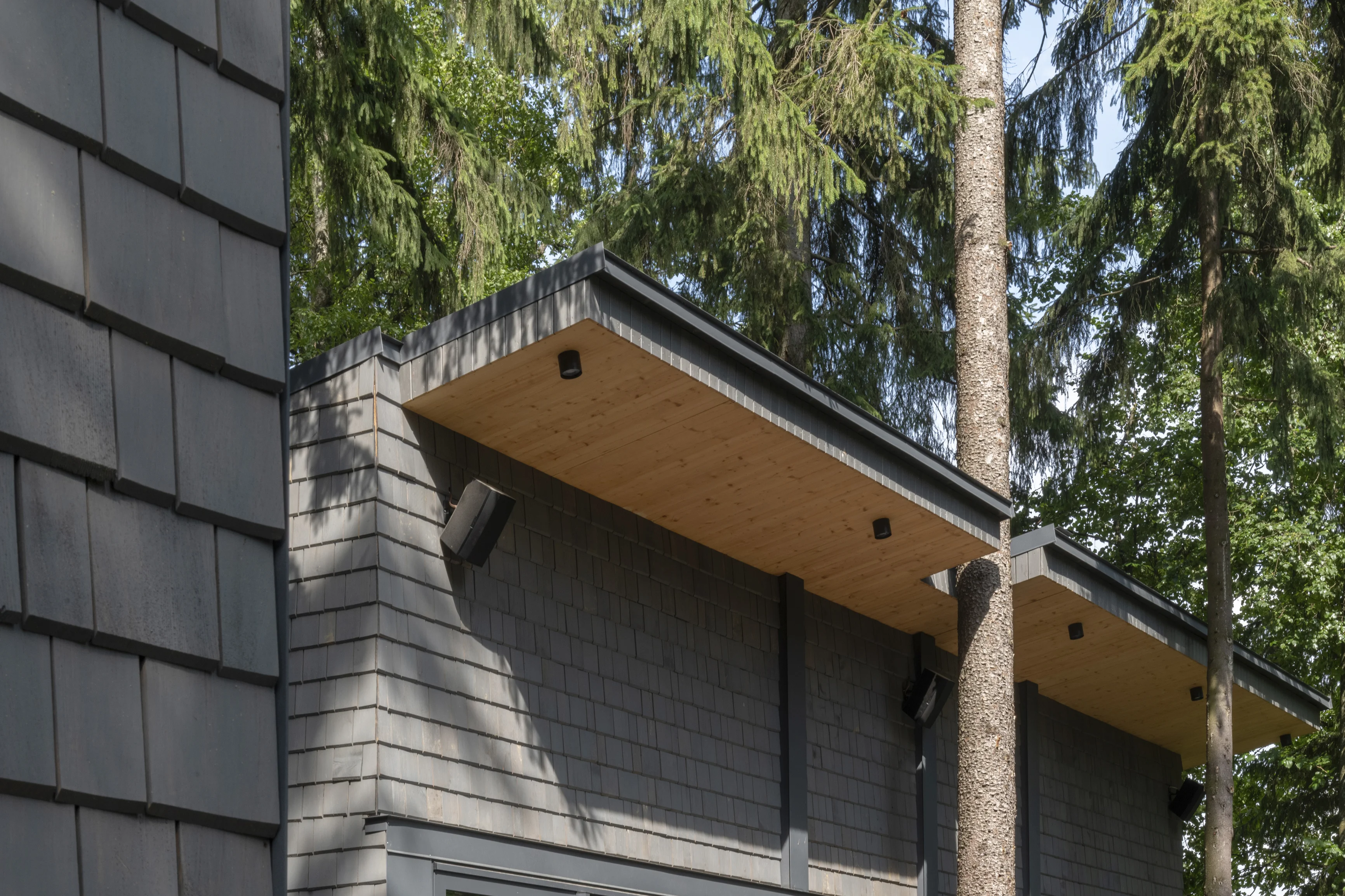 Применение современного и прочного материала CLT позволило выполнить сложное строение, органично вписанное в плотную лесную среду, и сформировать помещения большого объема без дополнительных опор. Так, здание было разделено на два объёма — общественный и жилой, которые соединены стеклянным коридором. Этот переход из структурного остекления, превращает каждый шаг в уникальный опыт: выходя из одной зоны, можно оказаться в еловом лесу, оставаясь при этом в тепле и уюте.