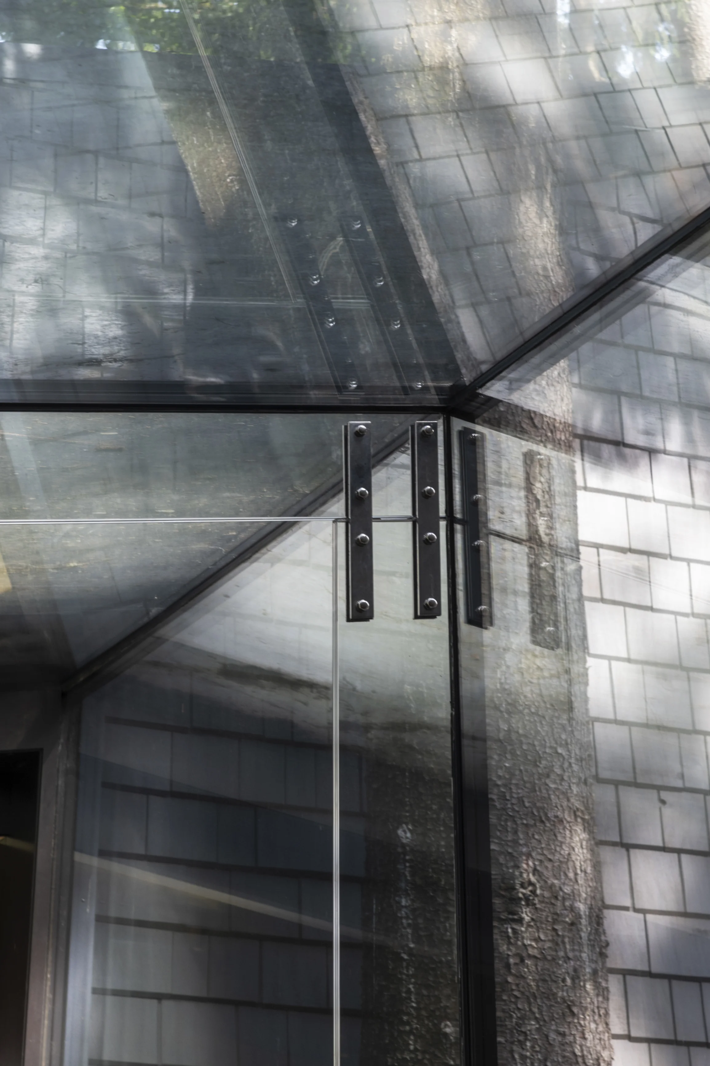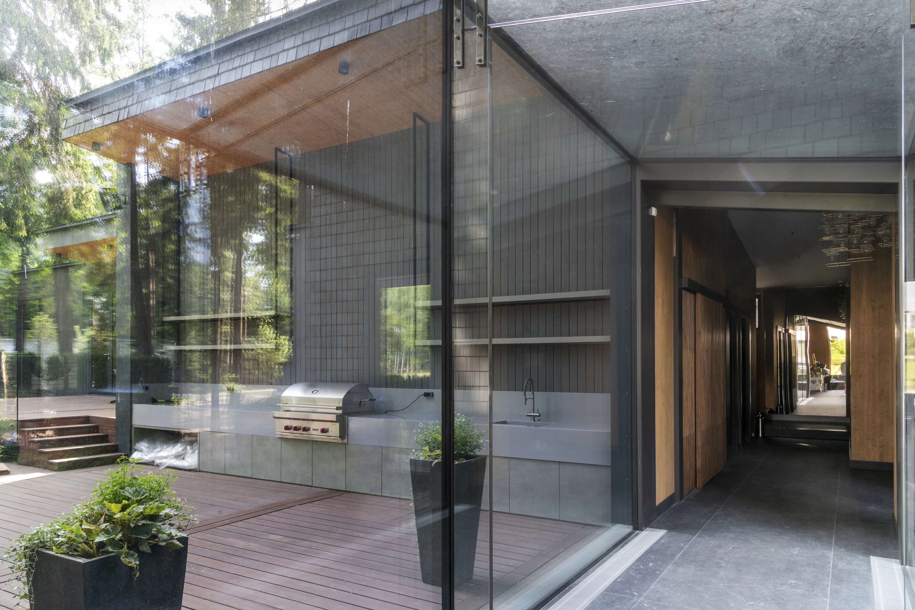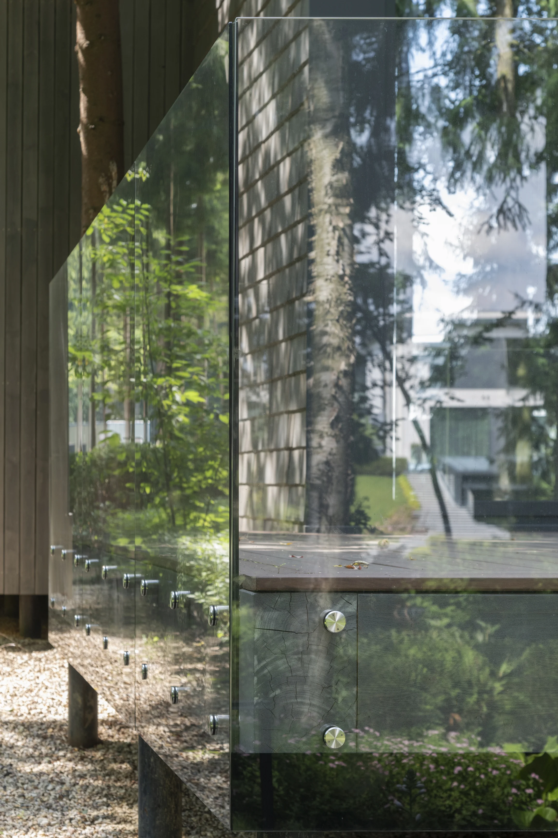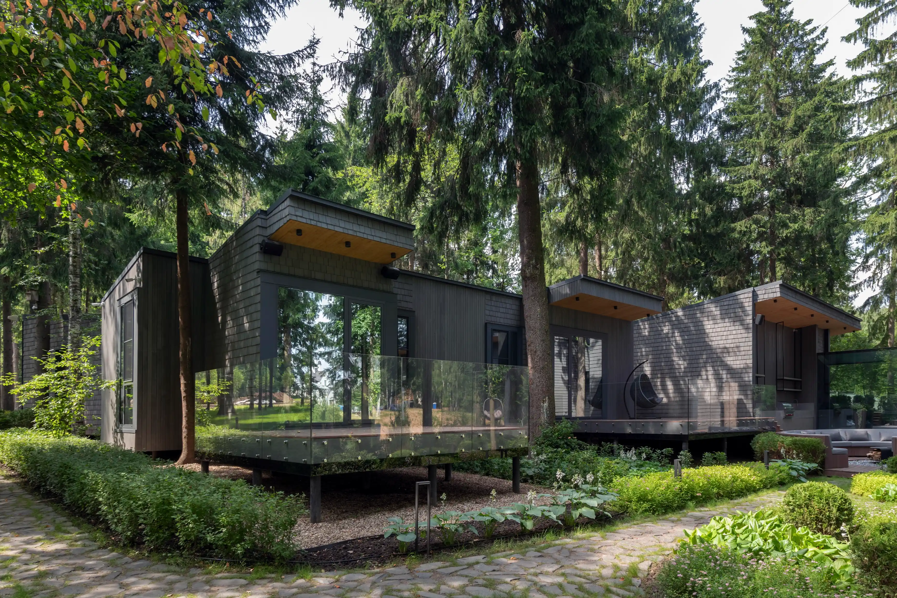 Применение современного и прочного материала CLT позволило выполнить сложное строение, органично вписанное в плотную лесную среду, и сформировать помещения большого объема без дополнительных опор. Так, здание было разделено на два объёма — общественный и жилой, которые соединены стеклянным коридором. Этот переход из структурного остекления, превращает каждый шаг в уникальный опыт: выходя из одной зоны, можно оказаться в еловом лесу, оставаясь при этом в тепле и уюте.
