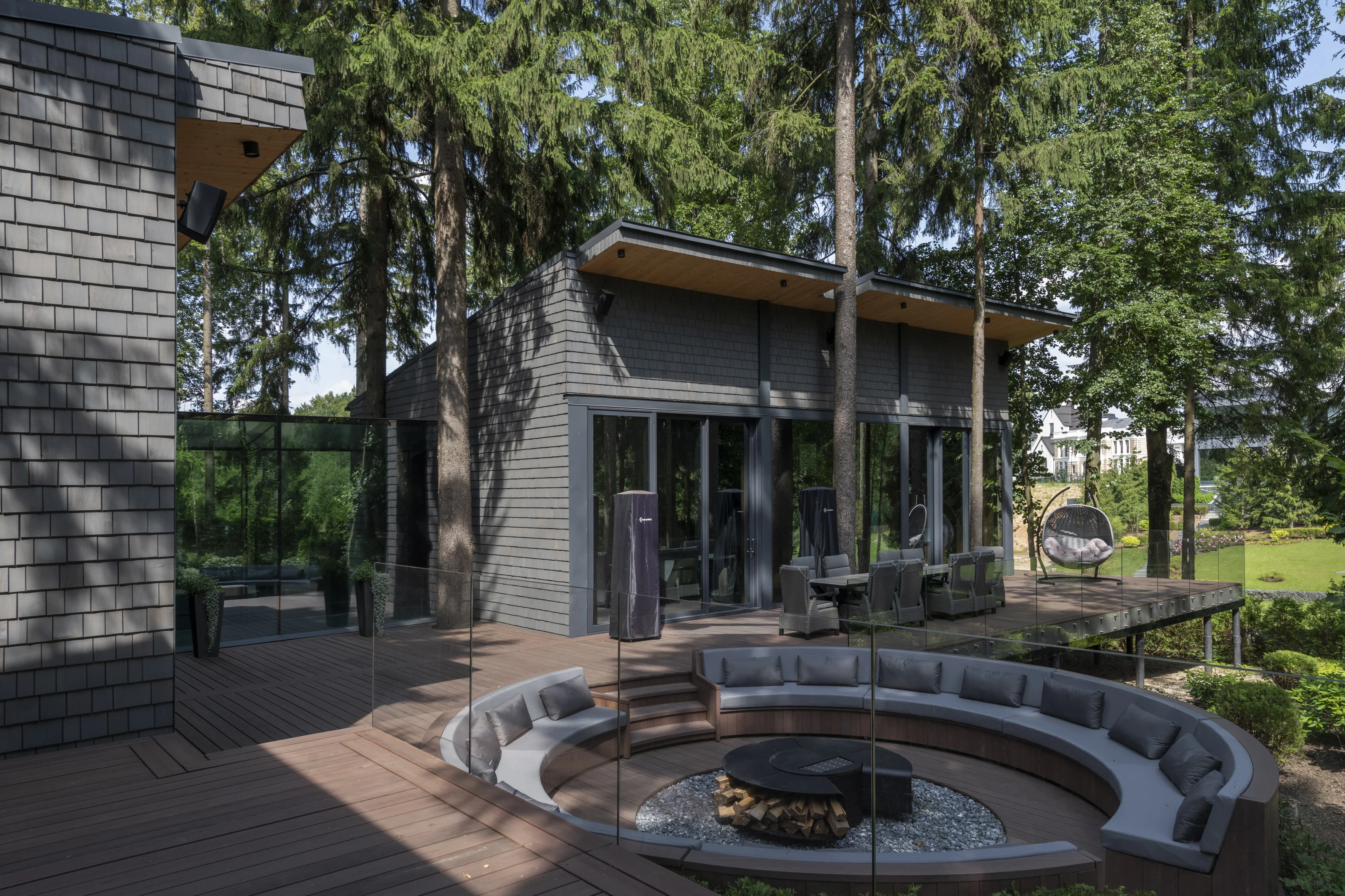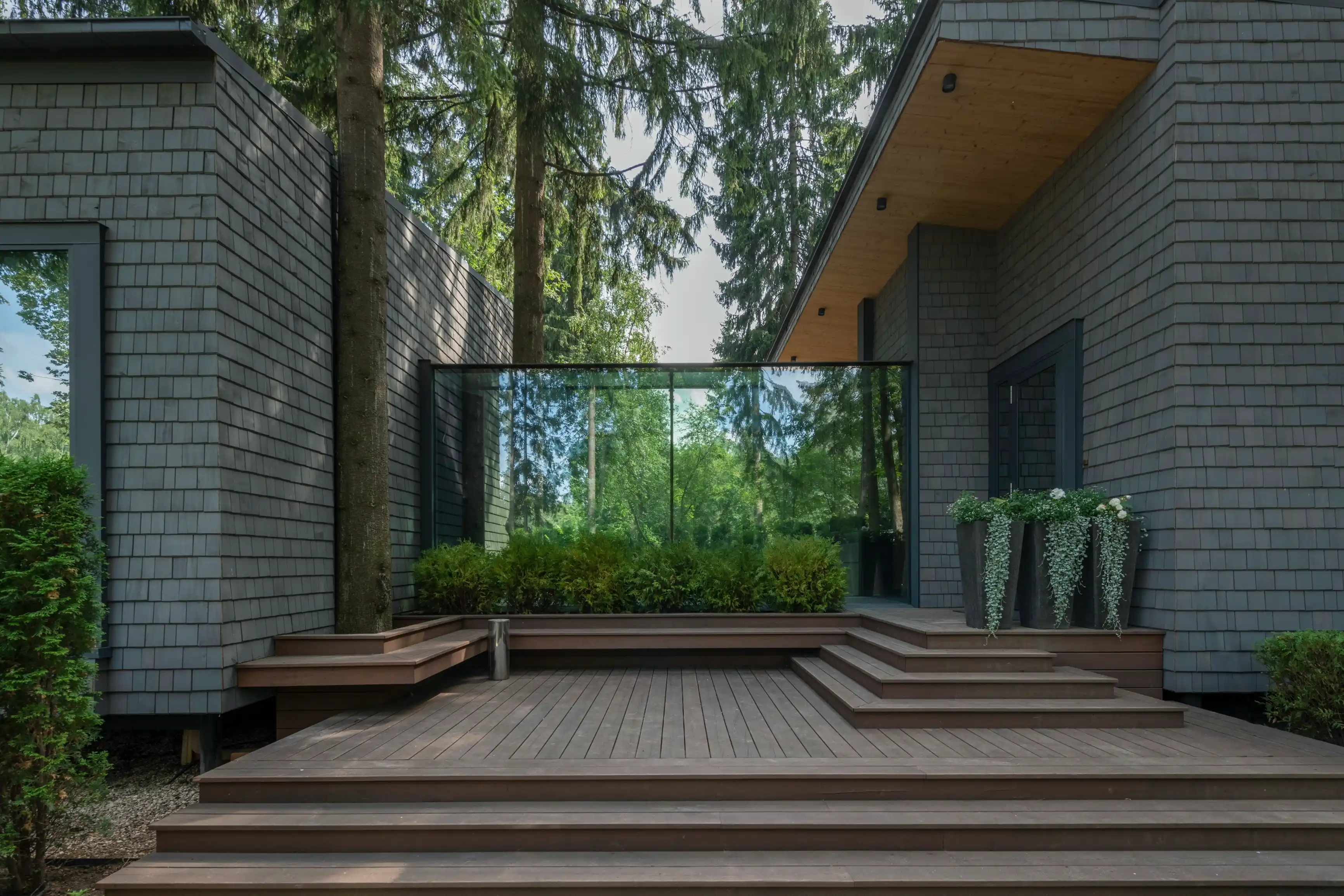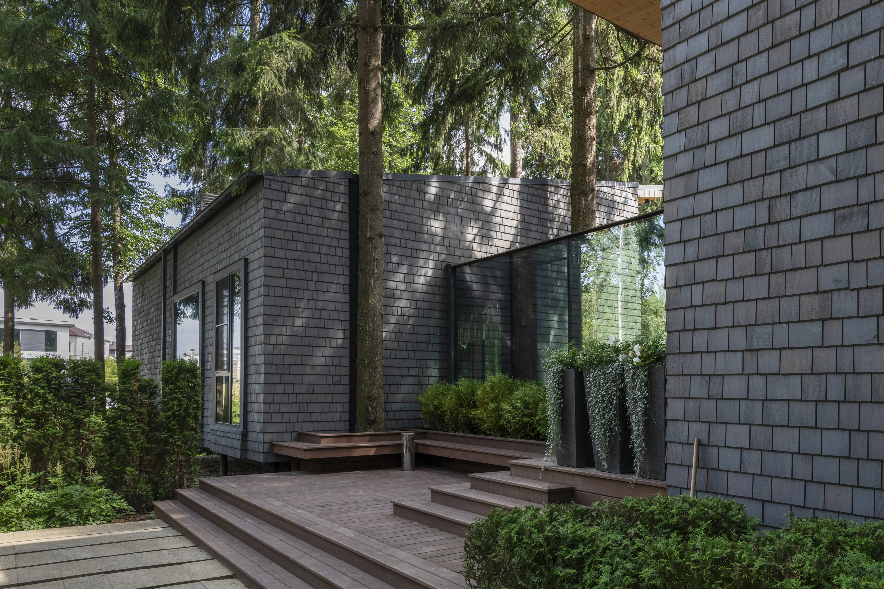 Утепление внешних стен и крыши выполнено в соответствии с теплотехническими нормами из экологически чистых материалов. Отделка фасадов — из натуральных природных материалов, таких как лиственничный шиндель и планкен из ели. Это первый премиальный дом из CLT, где были применены сложные технологичные решения: