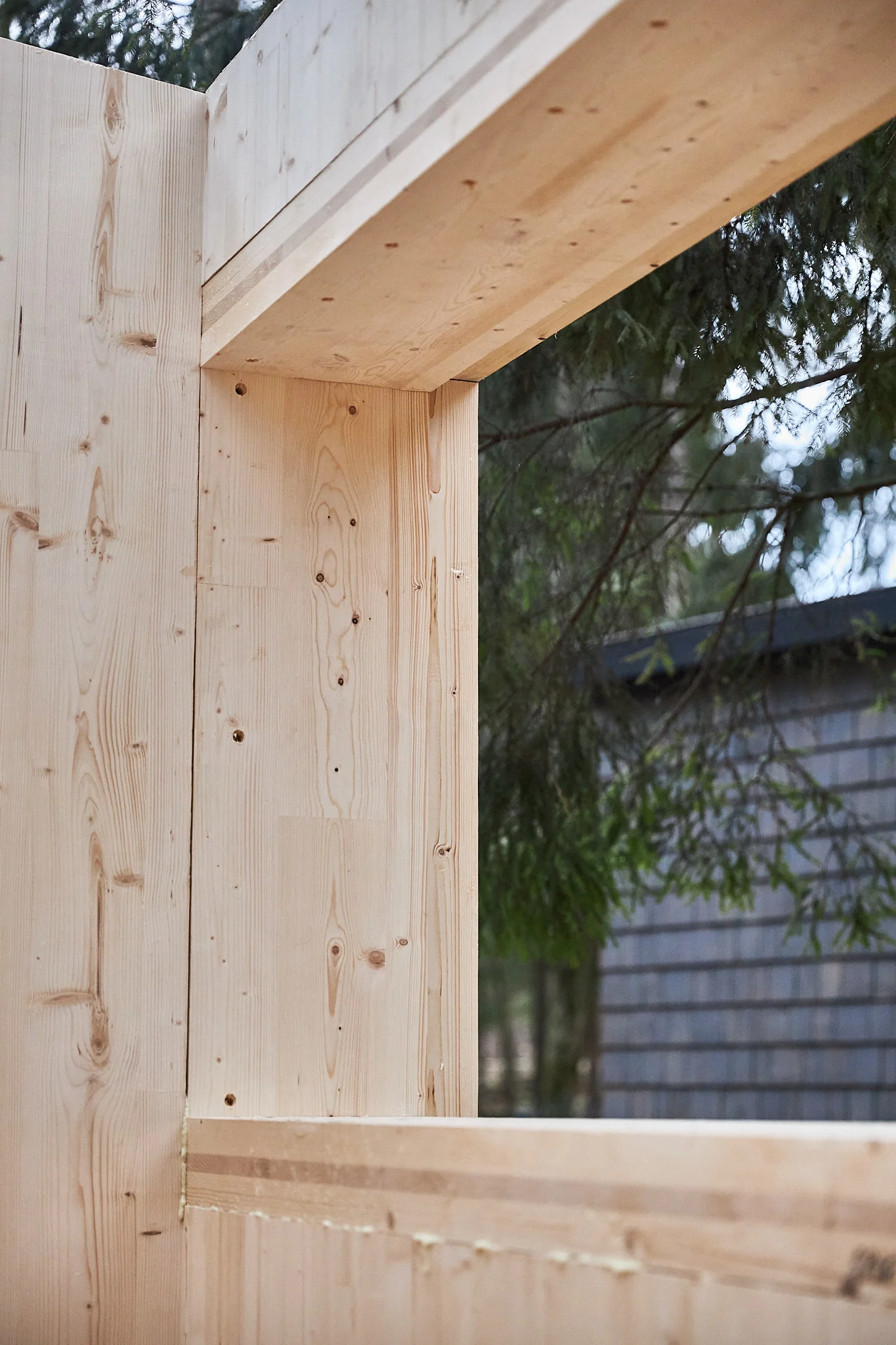 Все дверные и оконные элементы решены в специальных конструкциях из CLT панели, которые выполняют роль откосов, подоконников и монтажных мест для установки.
