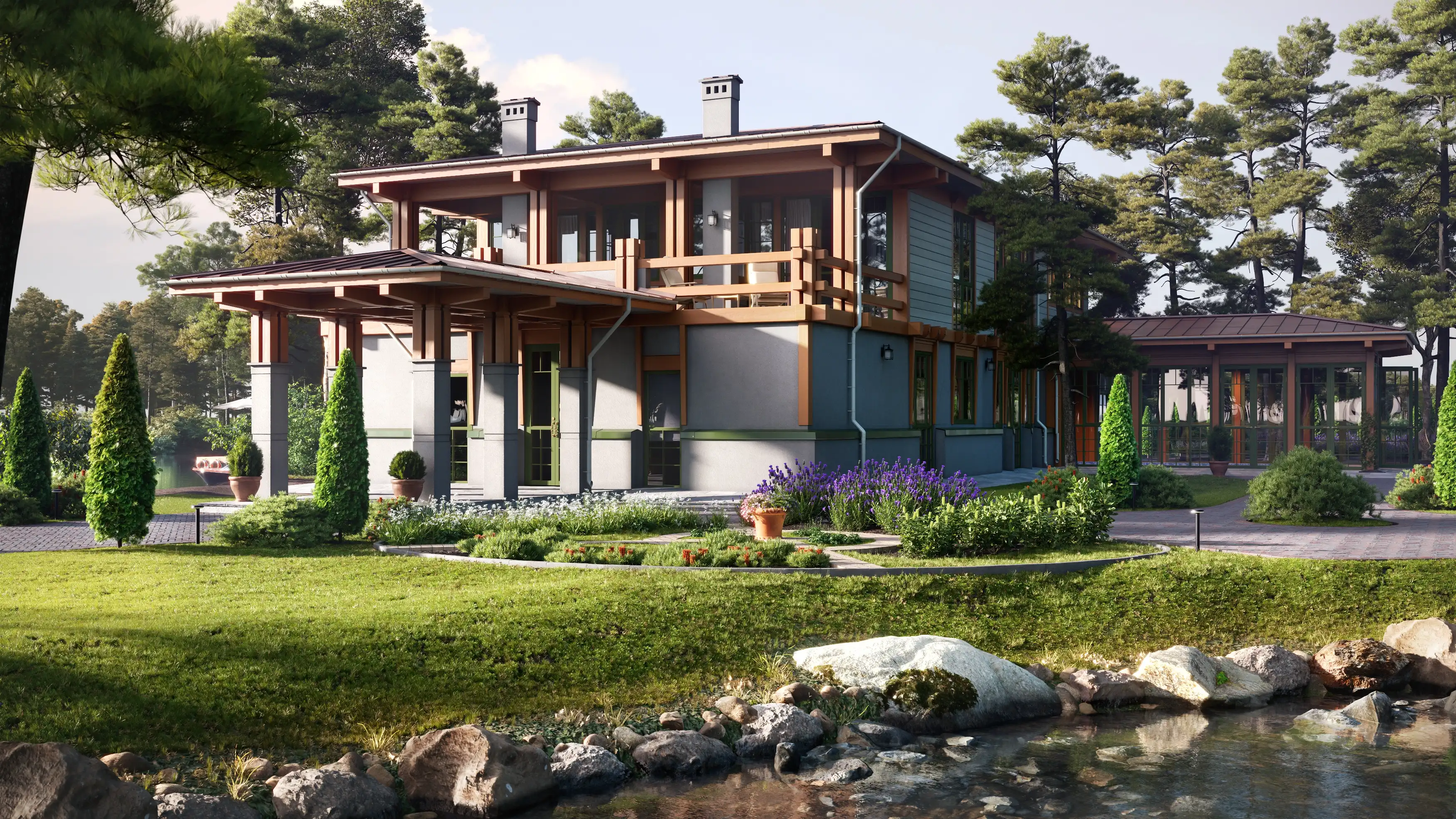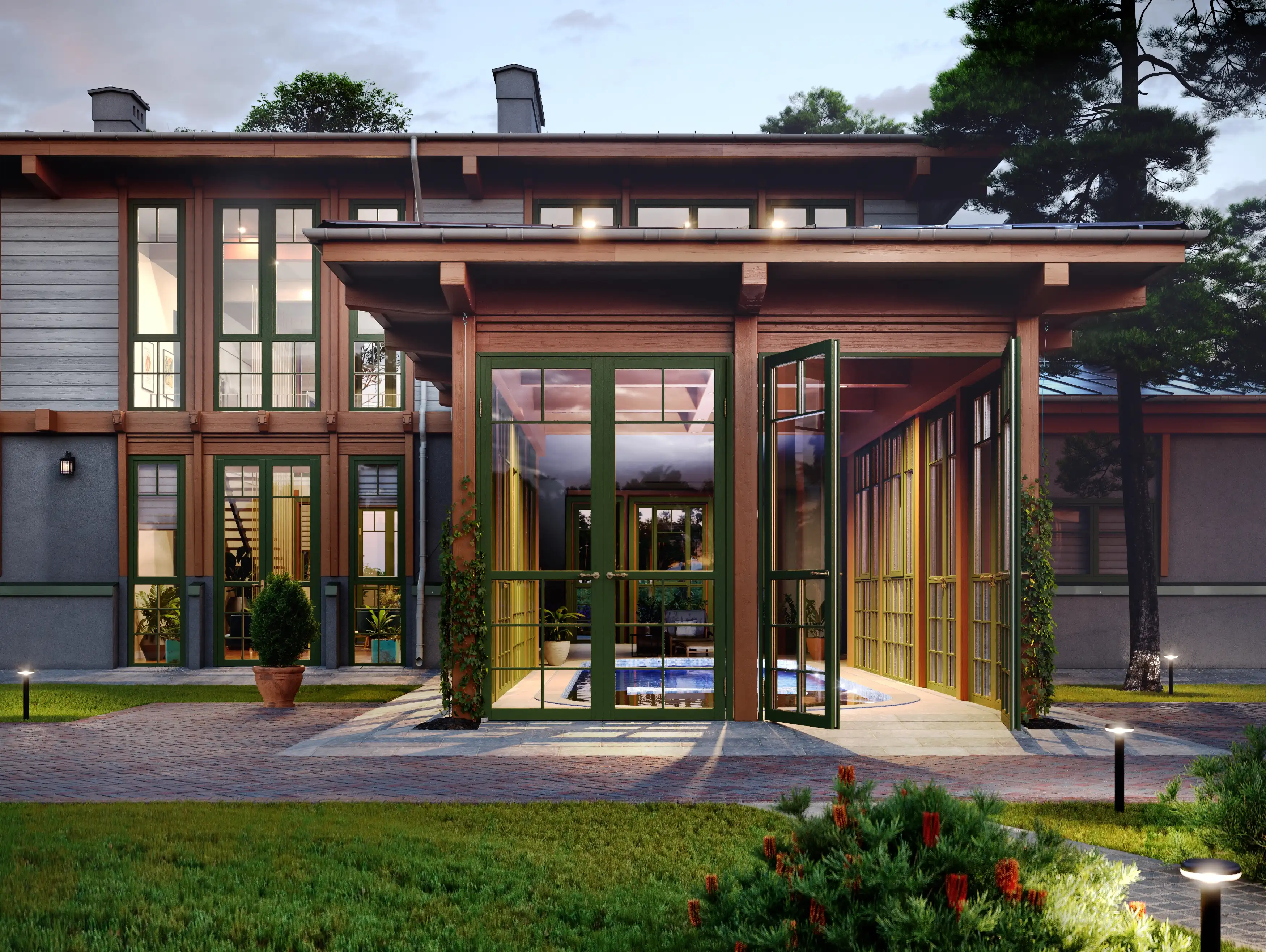 Конструкция террасы выполнена из клееного бруса: колонны сечением 190х190 мм, балки — 190х420. Оконные и дверные блоки индивидуального изготовления из деревянного профиля с заполнением двукамерными стеклопакетами.