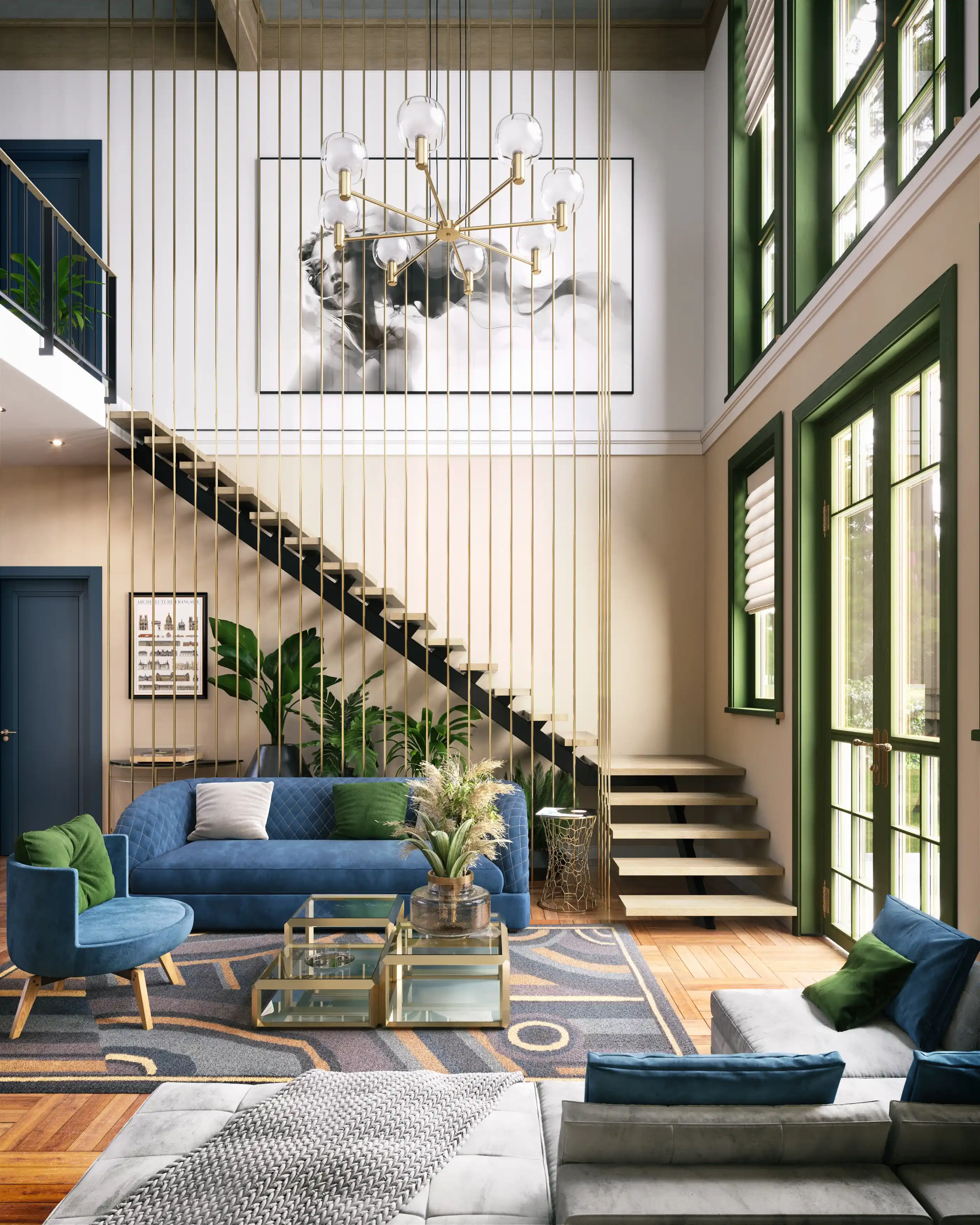 На визуализации представлена камерная зона отдыха в гостевом пространстве банного комплекса. Интерьер решён в современном стиле с тёплой, расслабляющей атмосферой: мягкие природные оттенки, дерево в отделке пола и обилие живых растений создают ощущение уюта и связи с природой. Высокие потолки и второй свет усиливают ощущение воздуха и простора, а акцентная люстра с латунными элементами придаёт интерьеру лёгкую элегантность. Лестница с лаконичным дизайном и графичная картина на стене добавляют современности.