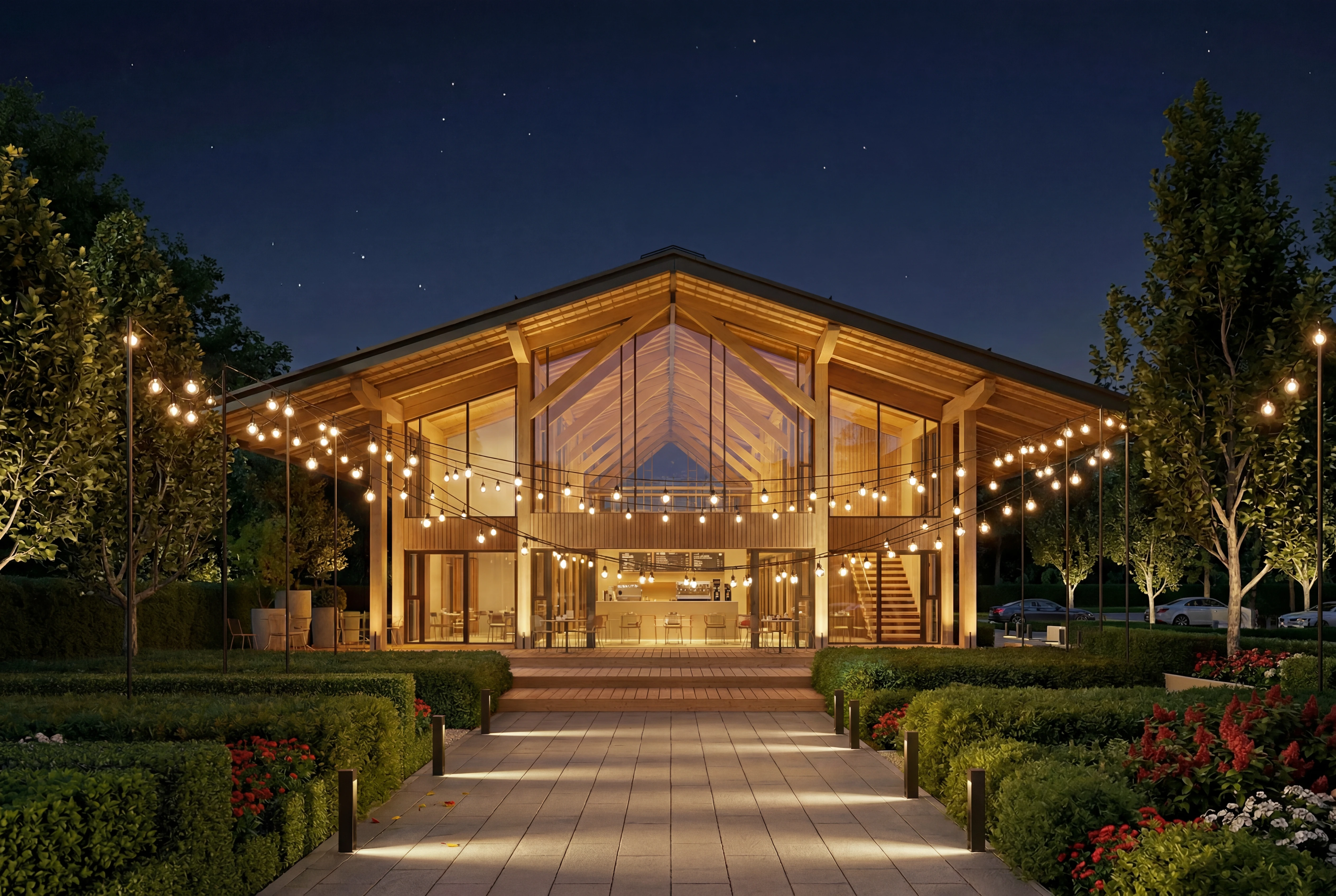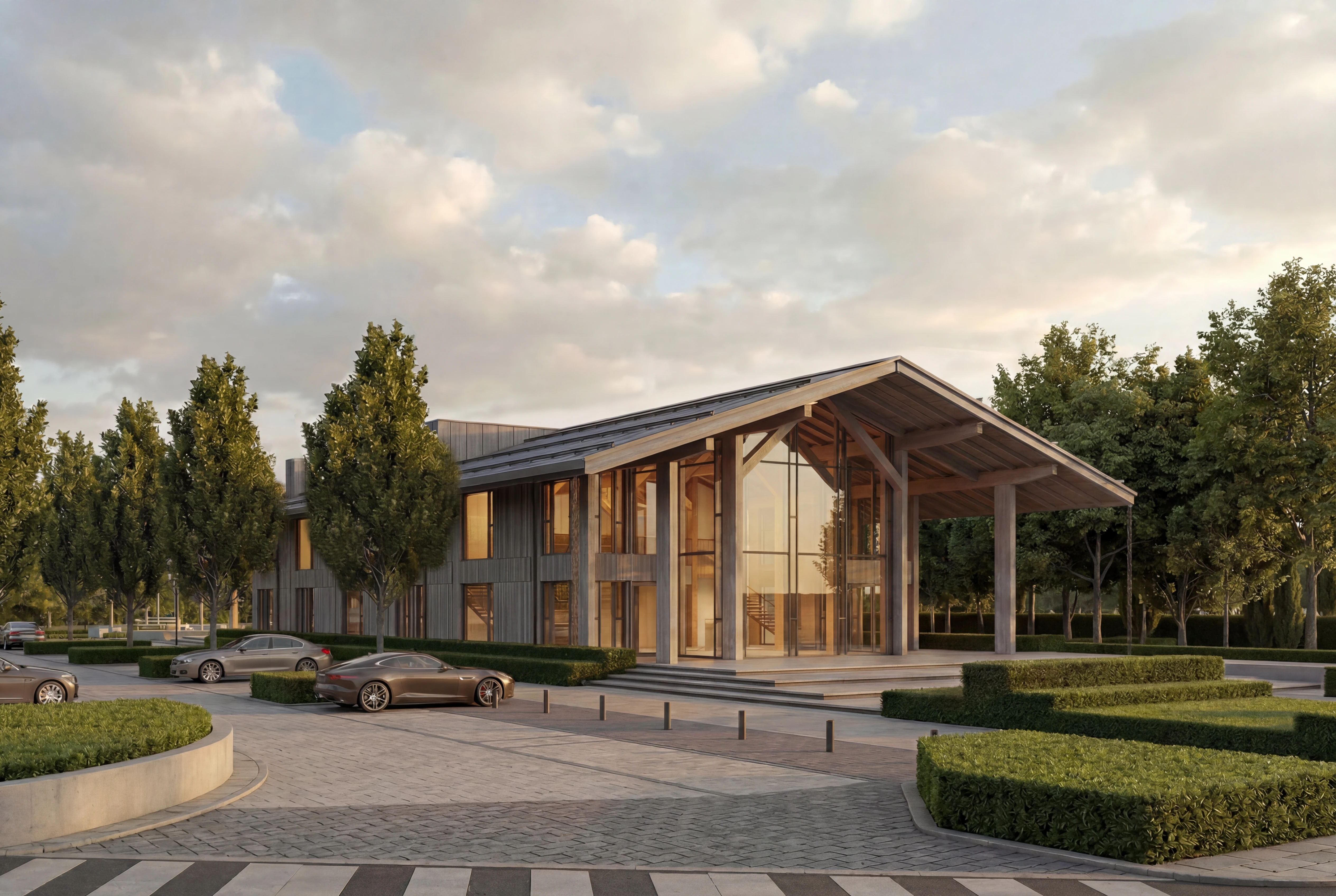 Двухэтажное здание в современном стиле с клееными несущими деревянными конструкциями. КДК видны на фасадах и в интерьере. Уникальность проекту придают свободные свесы кровли длиной более 4-х метров без дополнительных опор и подкосов. При этом регион строительства накладывает значительные ветровые нагрузки.