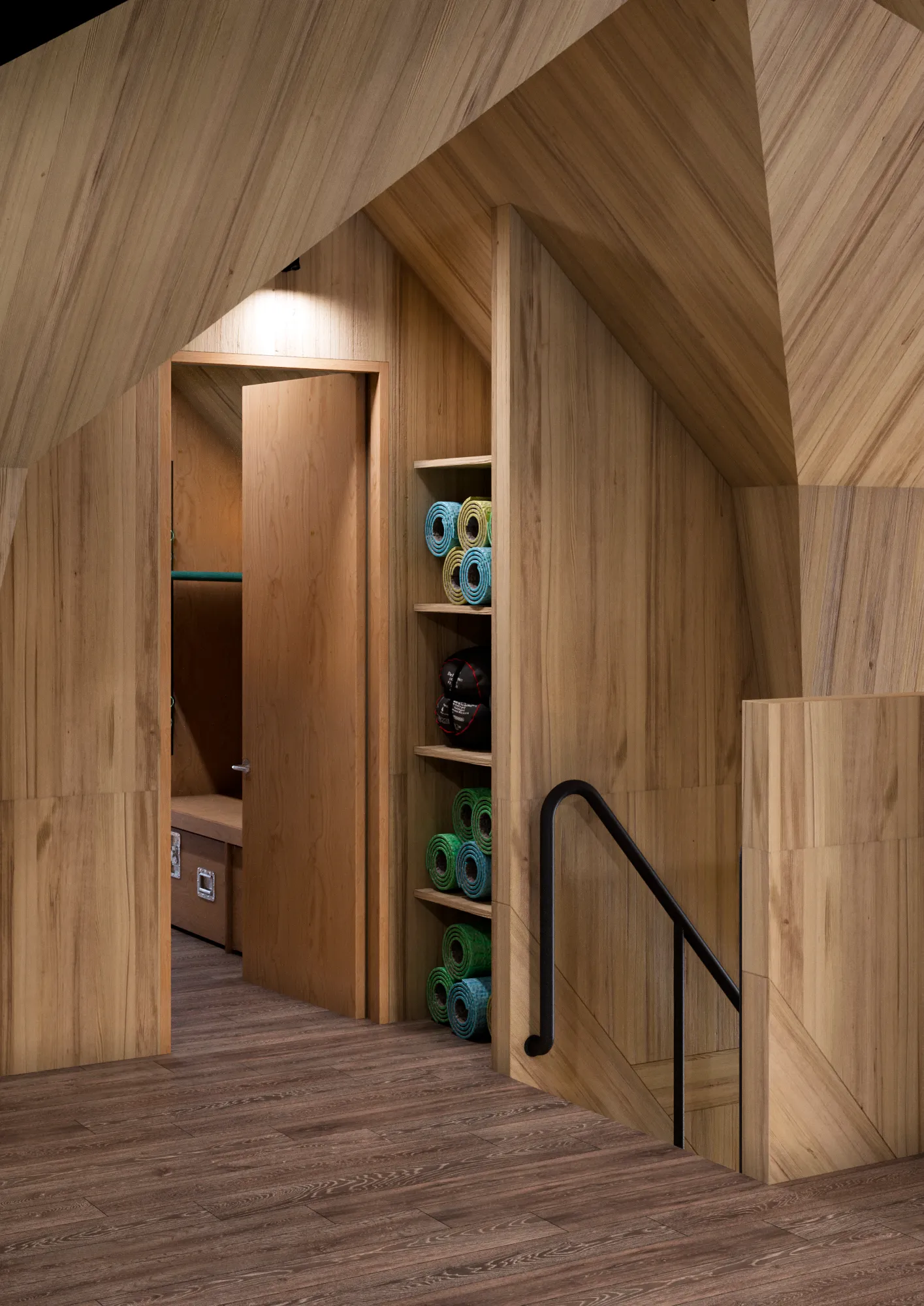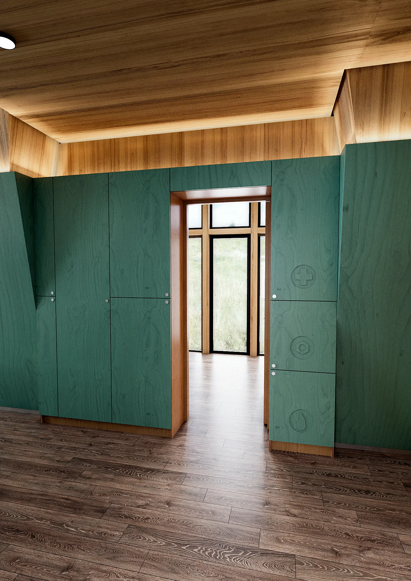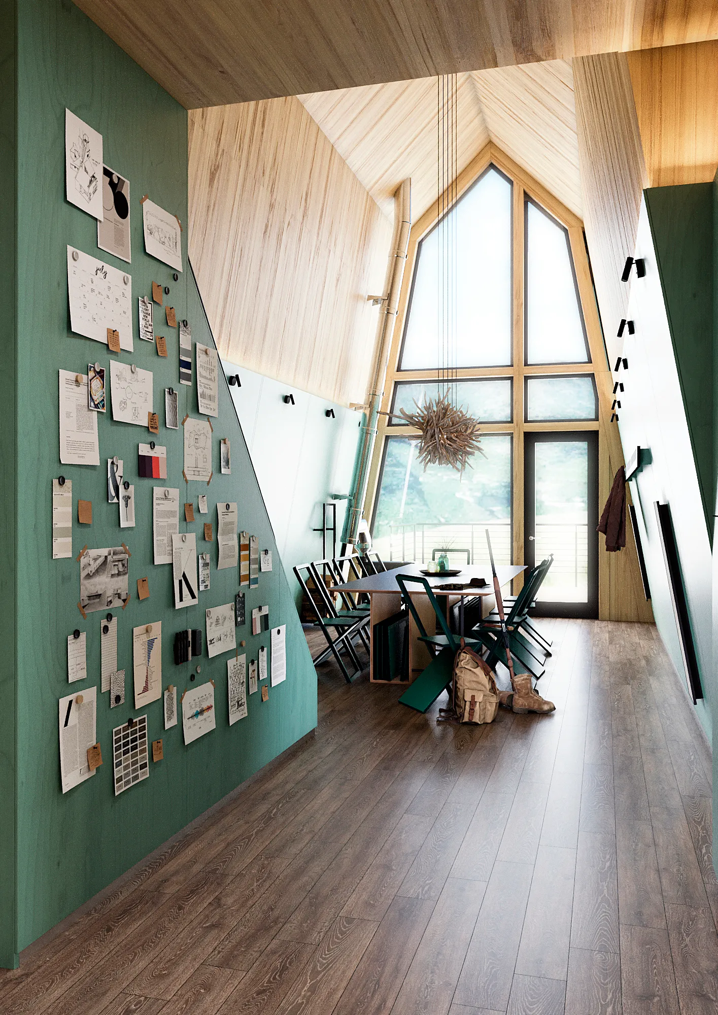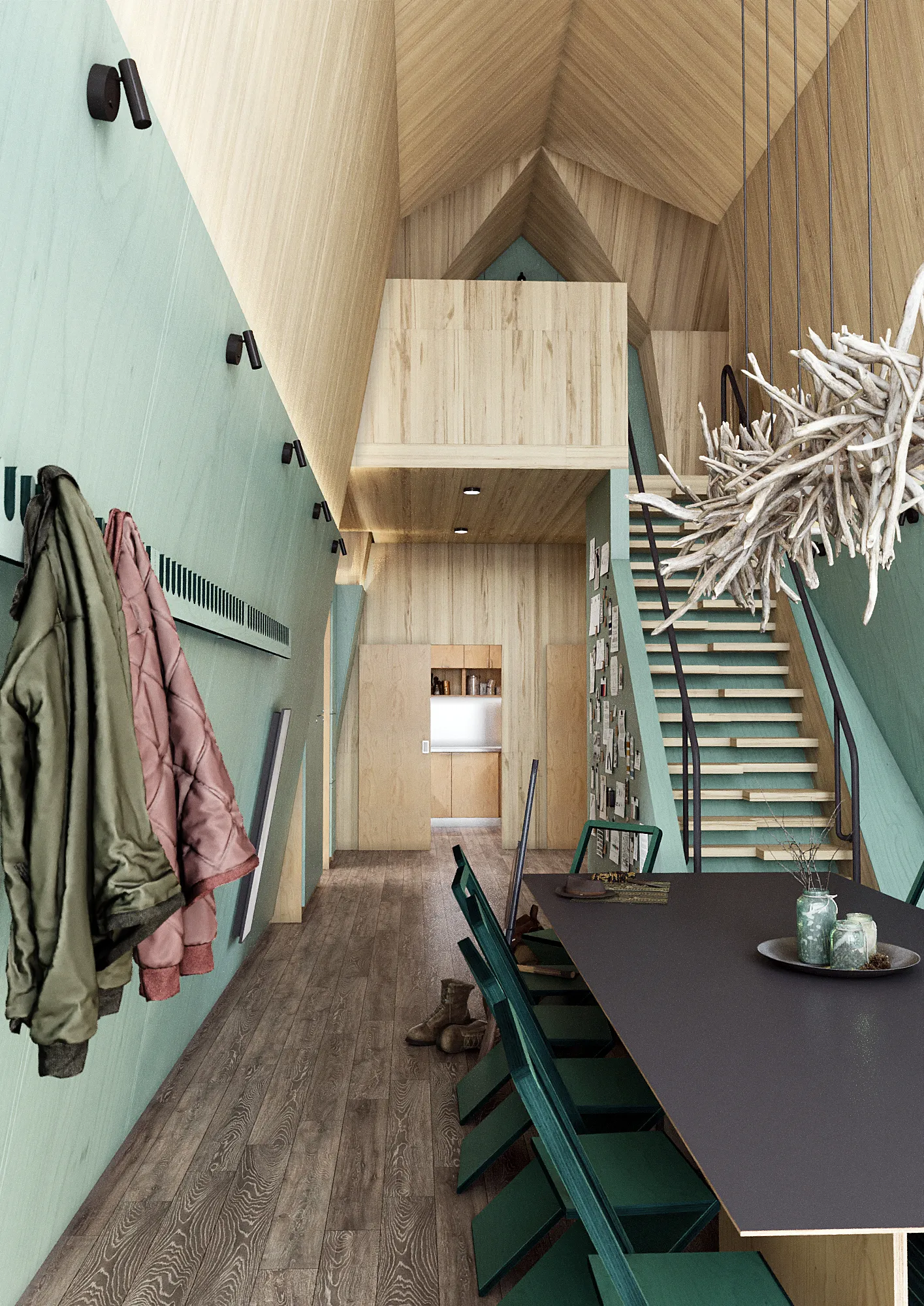 Силовой каркас, создающий пространство внутренних помещений, из панелей CLT. По силуэту многоугольный, с более пологой частью в уровне антресоли, для создания комфортной высоты и формы потолка. Для создания А-силуэта здания — стропильная система из доски. Общая высота здания 8,8 м, высота внутри здания 5,93 м. Отделка интерьеров из натуральных и износостойких материалов. Мебель индивидуального изготовления из влагостойкой фанеры.