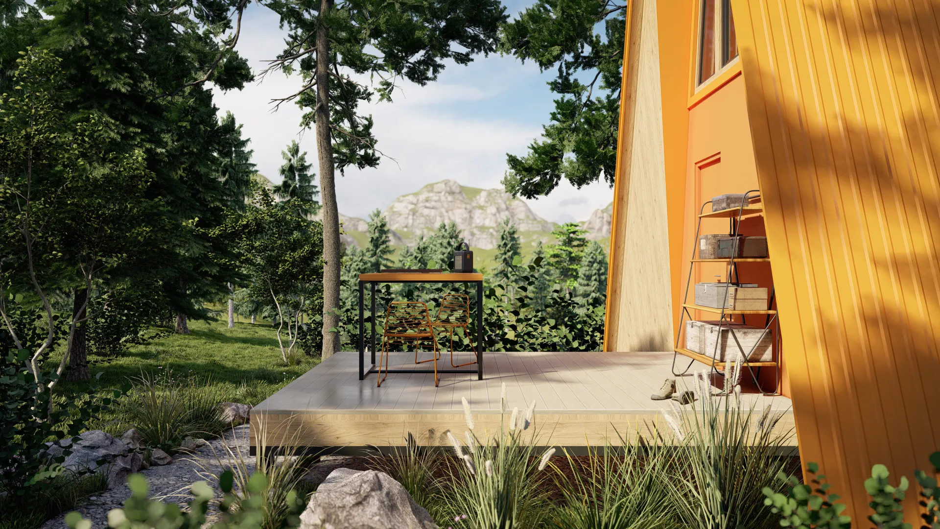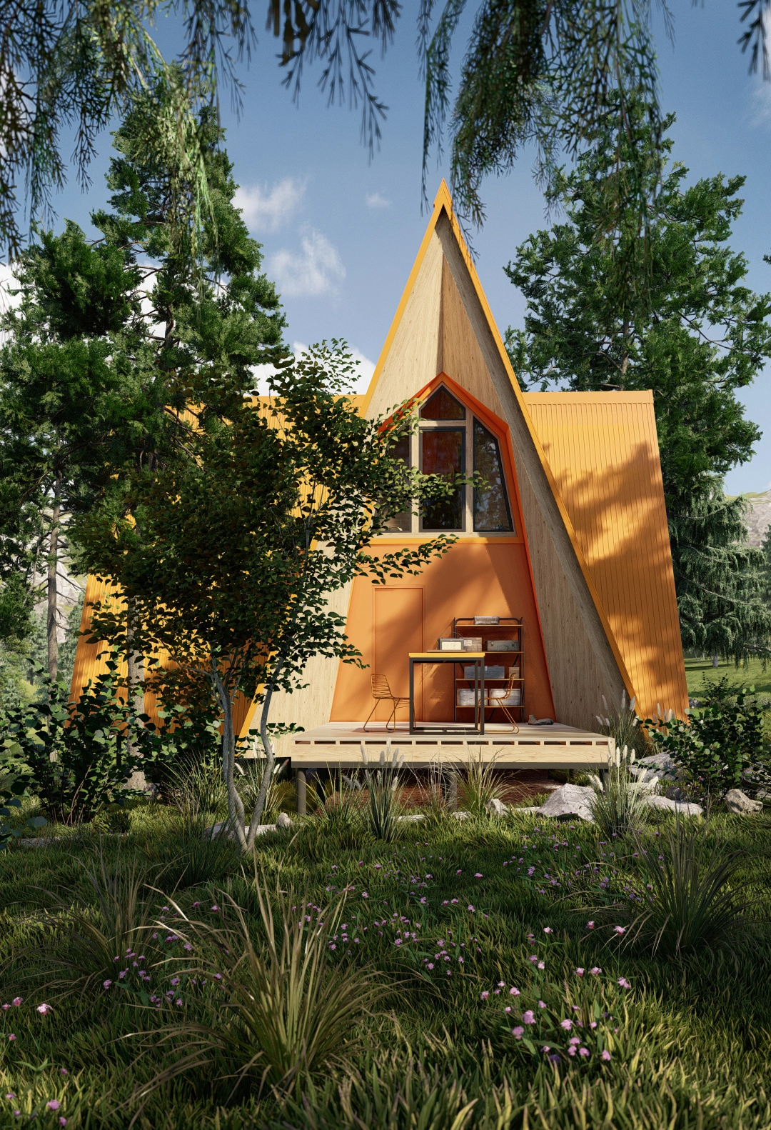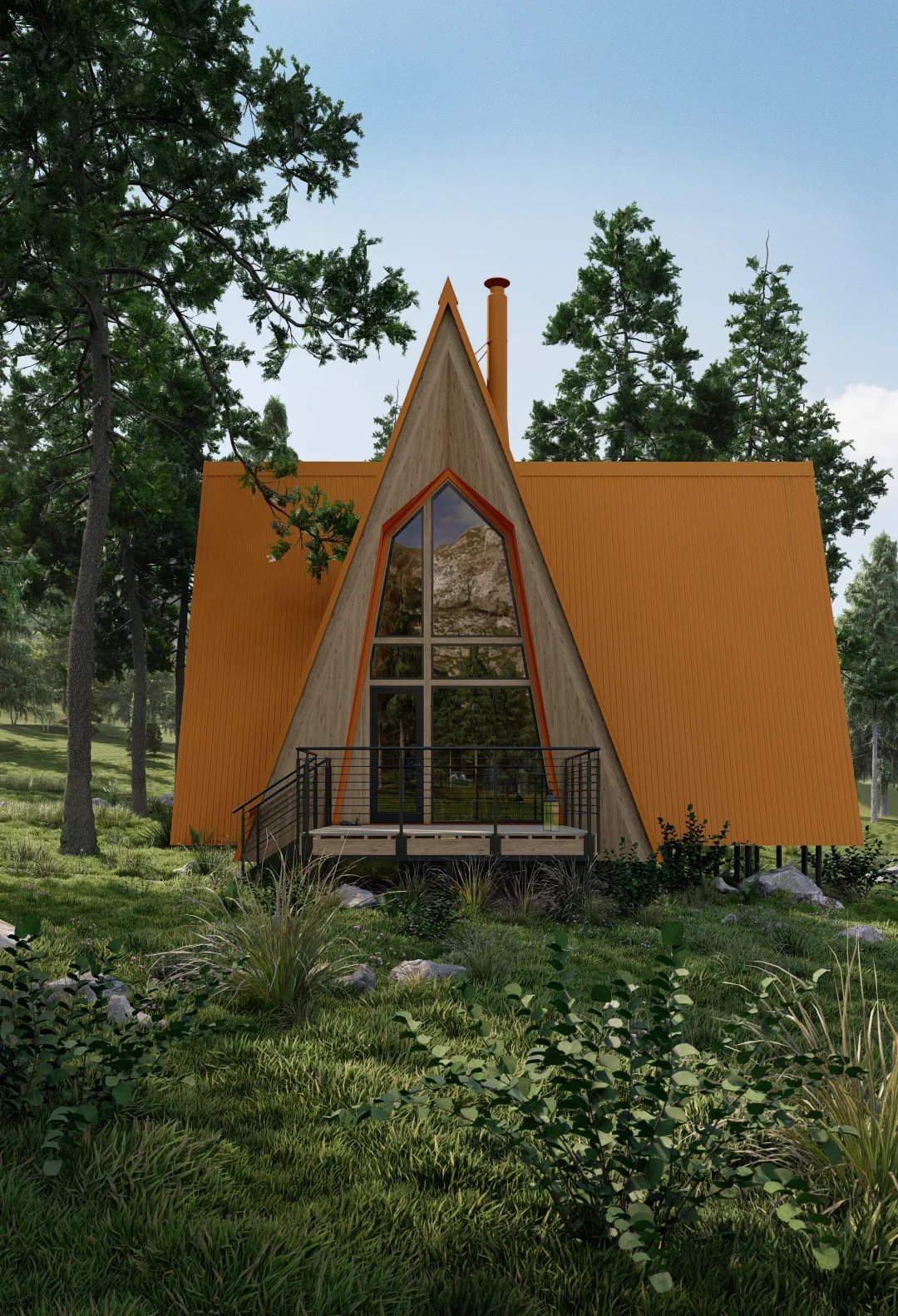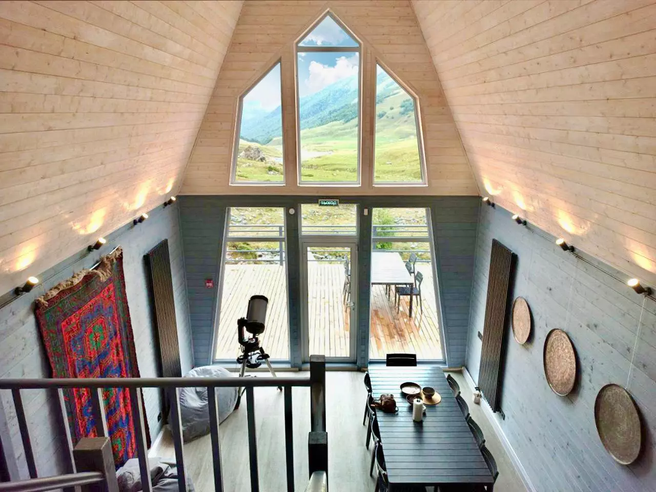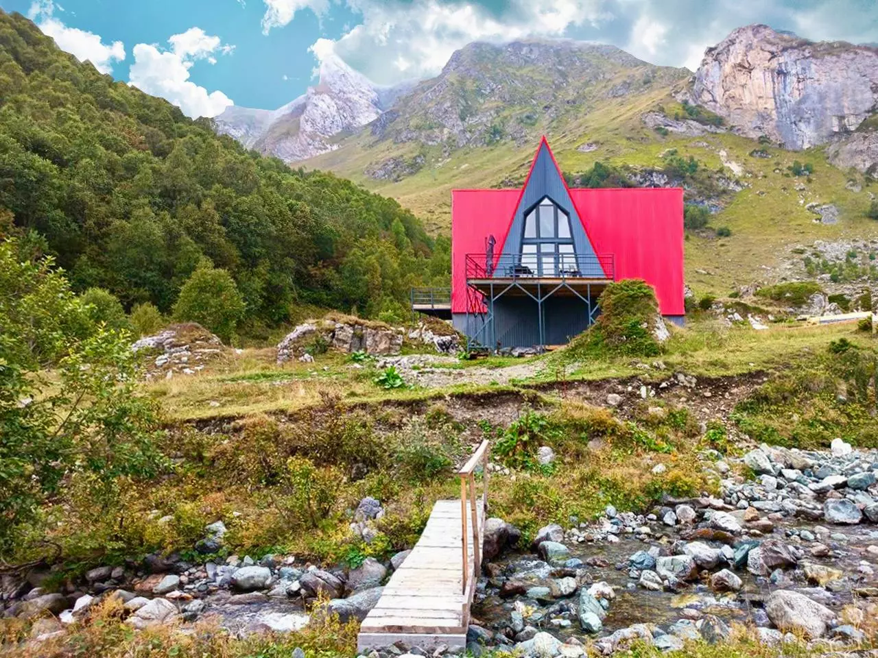 Приют в горах для охотников расположен на активном рельефе, перепад высот вдоль здания 2,7 м. С юга от участка проходит р. Кяфар. Приют в горах одноэтажный с антресолью, Х-образное в плане. Стилистическая и конструктивная схема — А-фрейм, здание которое по внешнему виду напоминает букву А. Фасады выполнены с витражами на 2 уровня здания, для достижения максимальной освещённости помещений. Для помещений кухни и душевой в несущем каркасе предусмотрен обсадной короб для окна.