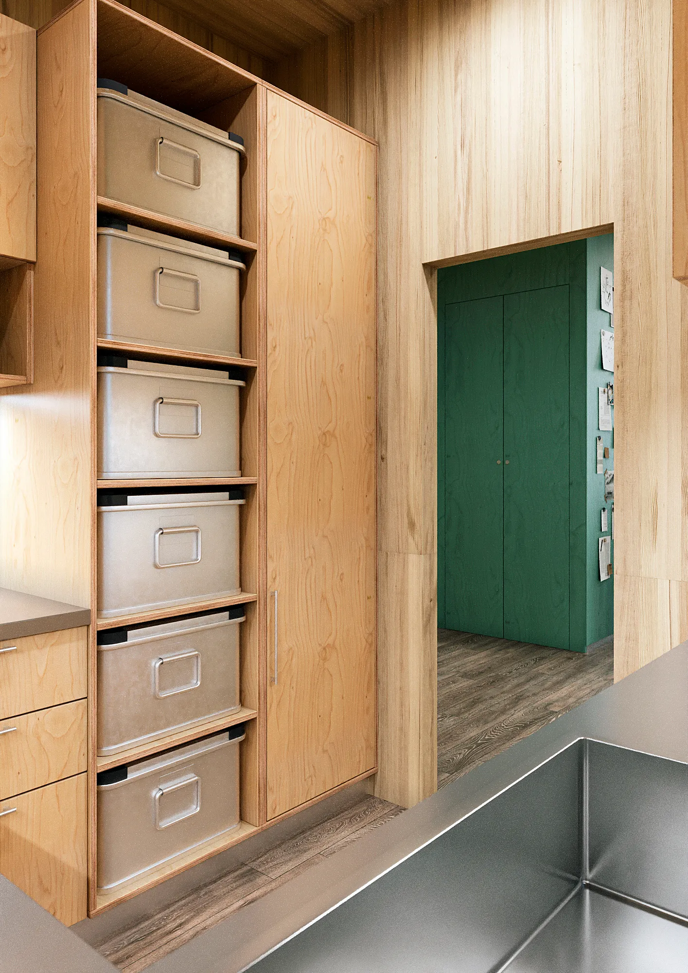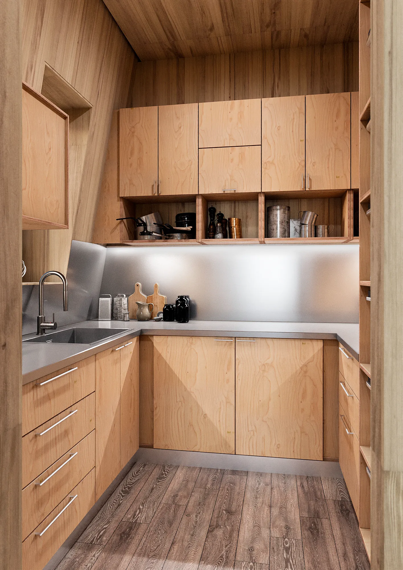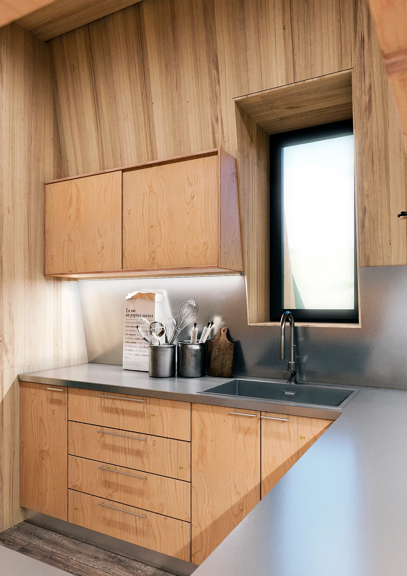Кухонная зона построена на основе готовых кемперских решений, что делает её компактной и функциональной. Вся система жизнеобеспечения приюта основана на автономной энергетике, позволяя находиться в гармонии с природой, сохраняя при этом комфорт и технологичность.