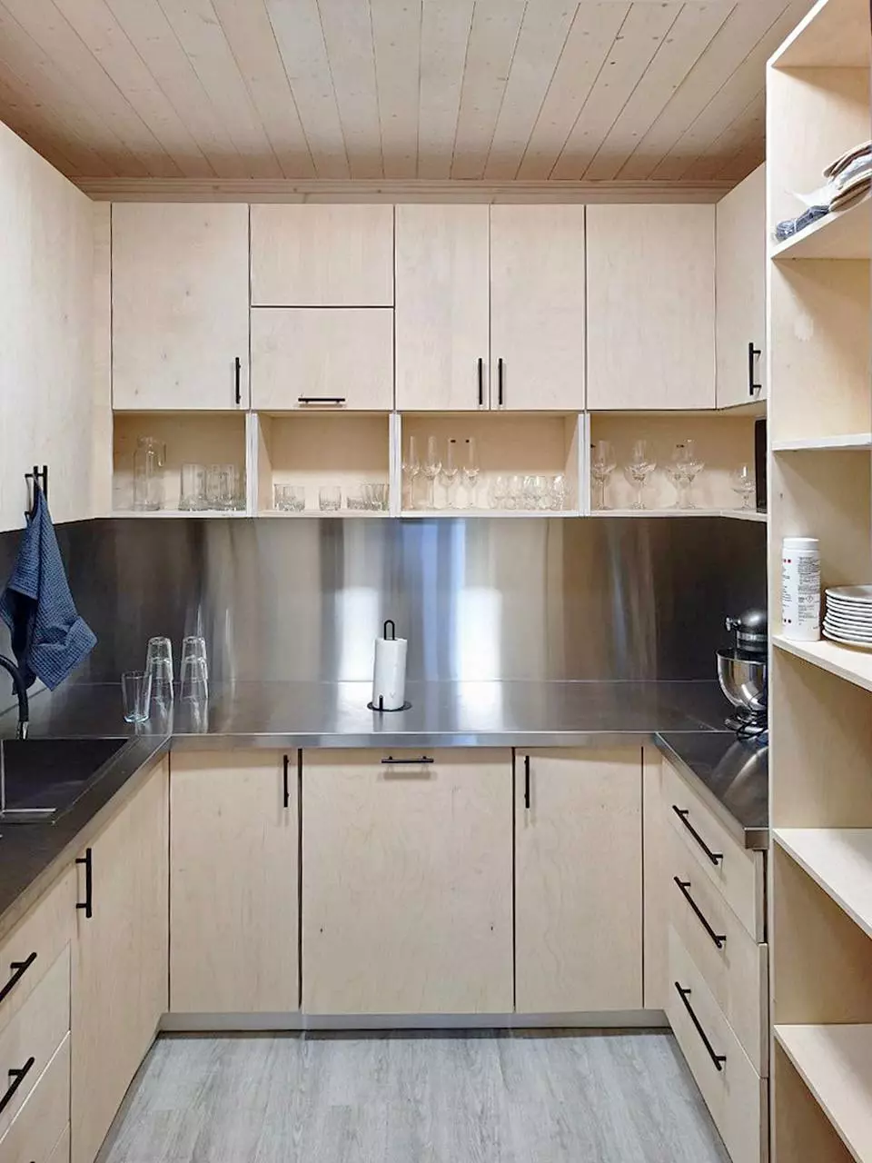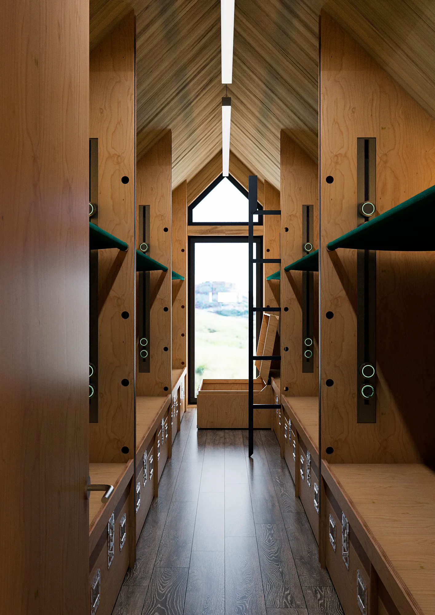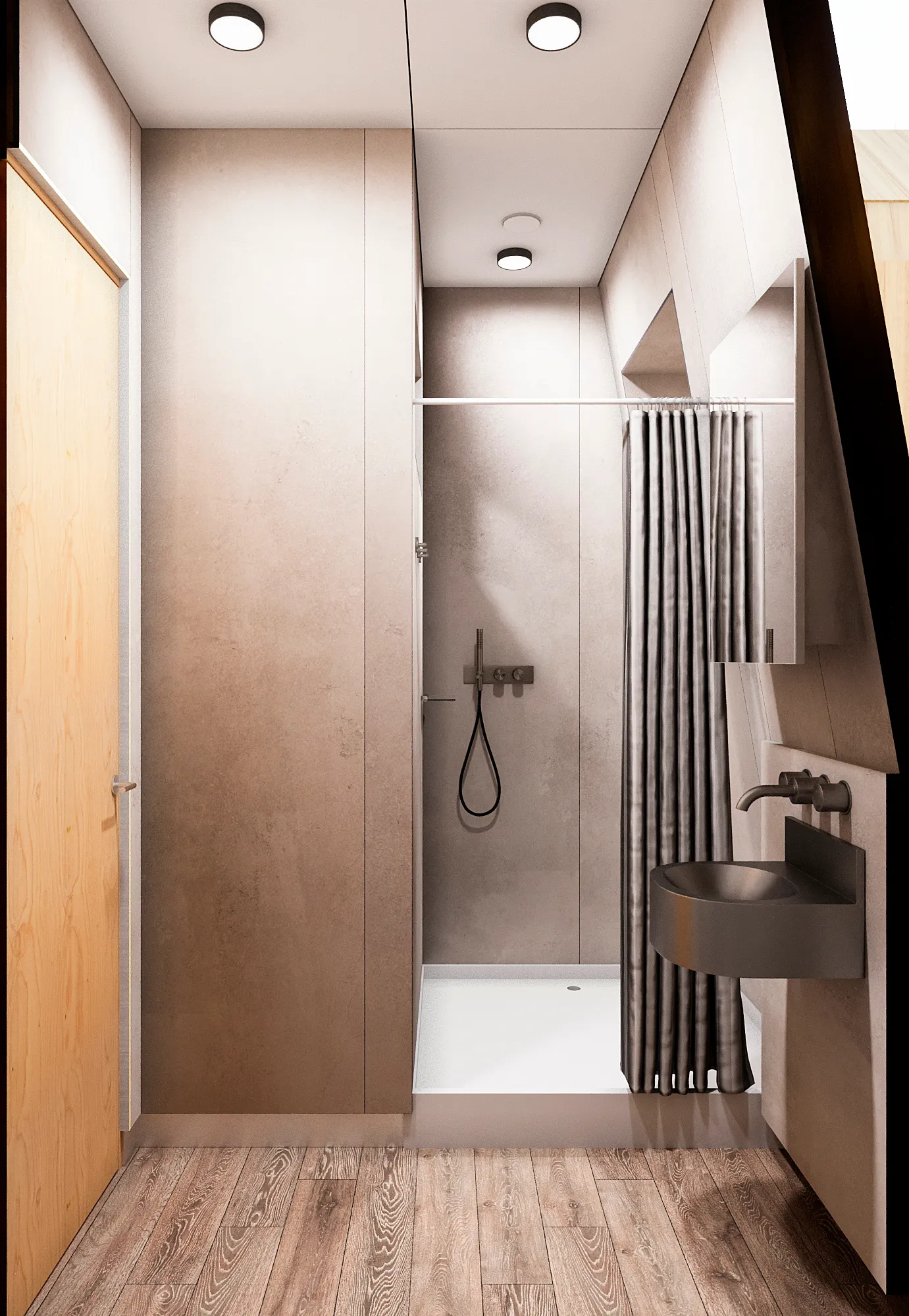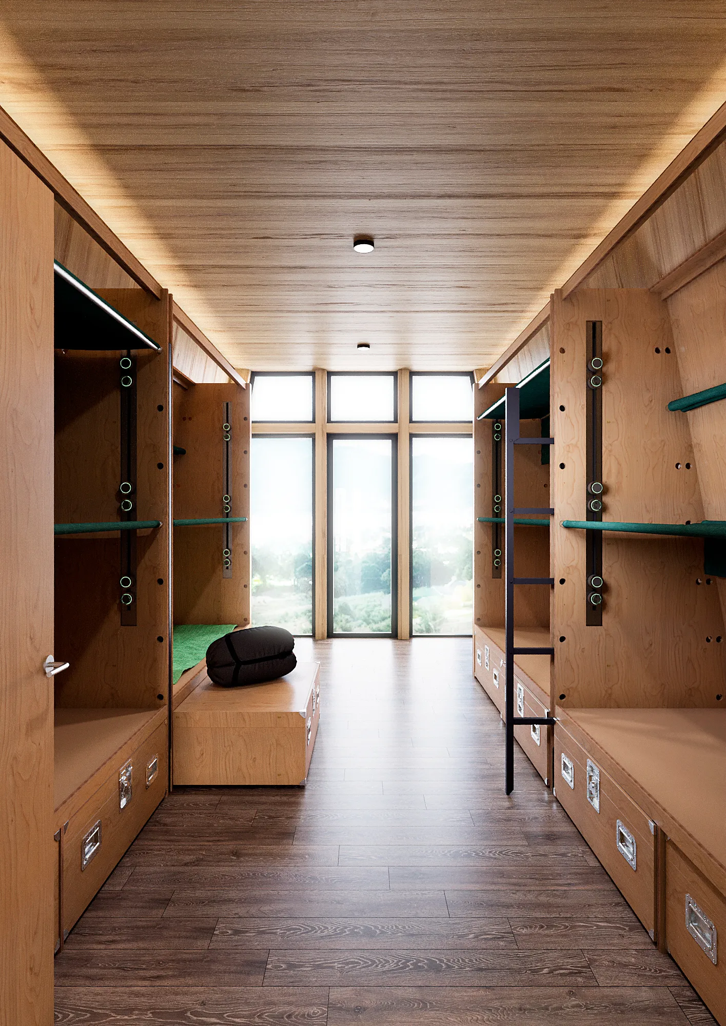 Кухонная зона построена на основе готовых кемперских решений, что делает её компактной и функциональной. Вся система жизнеобеспечения приюта основана на автономной энергетике, позволяя находиться в гармонии с природой, сохраняя при этом комфорт и технологичность.