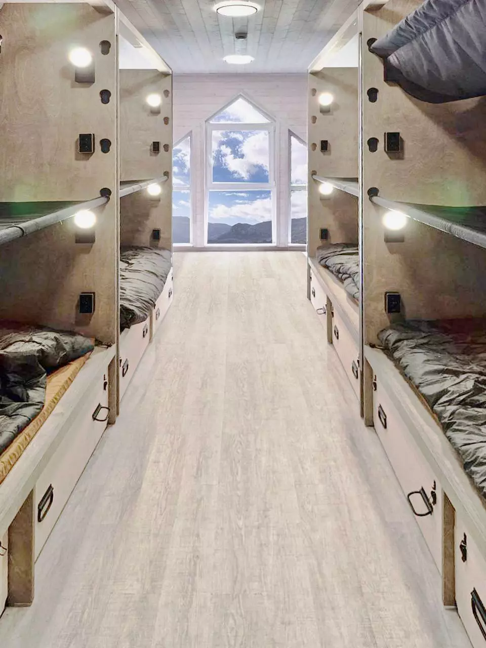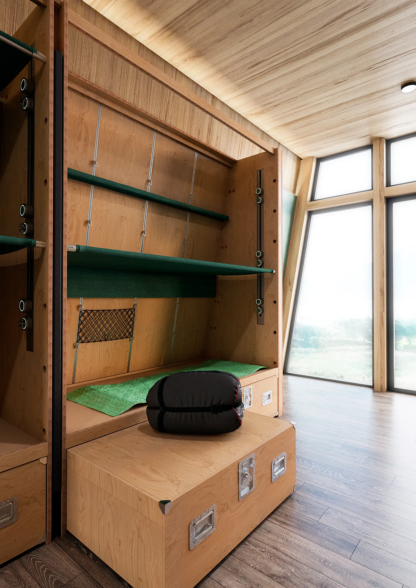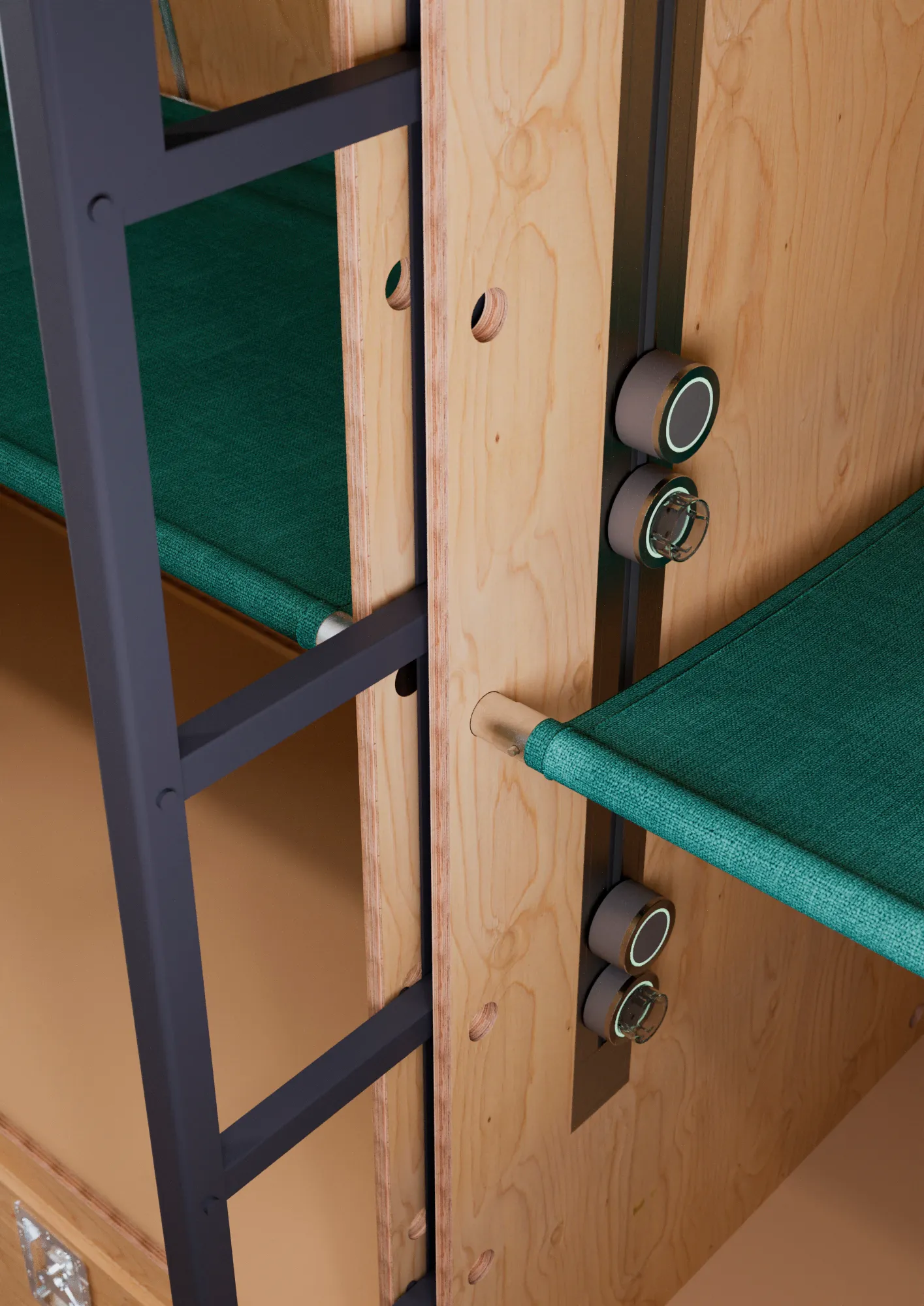 Особенностью пространства стали трансформируемые тканевые кровати, которые можно регулировать по высоте и количеству в зависимости от числа проживающих. Продуманные встроенные решения — рундуки, лесенки, а также подвижные 12-вольтовые розетки — обеспечивают удобство и мобильность обитания.