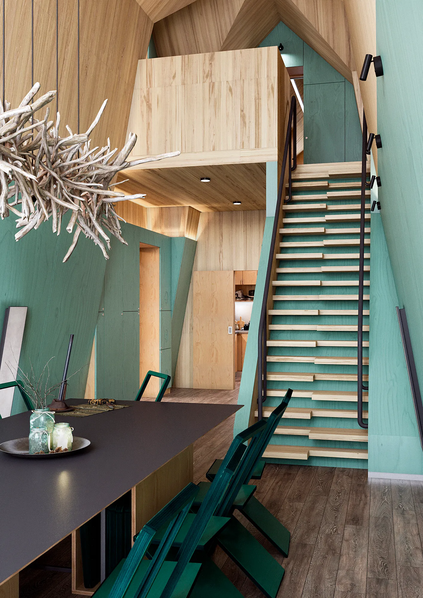 Интерьер приюта в горах для охотников выполнен с акцентом на функциональность, долговечность и автономность. В отделке использованы исключительно натуральные и износостойкие материалы, подчеркивающие связь с природой. Вся мебель выполнена по индивидуальному проекту из влагостойкой фанеры.